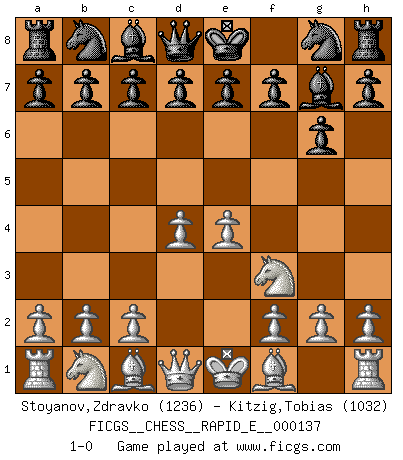 Last move : 1-0 2014 November 20 23:9:24 [Event "FICGS__CHESS__RAPID_E__000137"] [Site "FICGS"] [Date "2014.10.13"] [Round "1"] [White "Stoyanov,Zdravko"] [Black "Kitzig,Tobias"] [Result "1-0"] [WhiteElo "1236"] [BlackElo "1032"] 1.e4 g6 2.Nf3 Bg7 3.d4 1-0 This chess game has been lost on time (started : 2014.10.13 10:9:37) Robatsch (Modern) defense Player White won this chess game. Follow this game move after move (download)Chess mastery essentially consists of analyzing Chess positions accurately. (Mikhail Botvinnik) Ich war zu klein für die Schach-Schülermannschaft! (Woody Allen) No soy una persona materialista y por eso, no resiento la falta o pérdida del dinero. La ausencia de cosas mundanas carece de importancia. Ya que el Ajedrez es una forma en la que puedo ser tan materialista como yo desee sin tener la necesidad de vender mi alma. (Jamie Walter Adams) Pour se monter efficace, un Cavalier a besoin d'avant-postes ! Les Cavaliers font les meilleurs bloqueurs de pions passés. When a man with money meets a man with experience, the man with experience leaves with money and the man with money leaves with experience. (Anonymous)