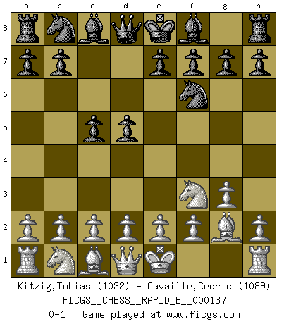 Last move : 0-1 2014 November 16 22:56:19 [Event "FICGS__CHESS__RAPID_E__000137"] [Site "FICGS"] [Date "2014.10.13"] [Round "1"] [White "Kitzig,Tobias"] [Black "Cavaille,Cedric"] [Result "0-1"] [WhiteElo "1032"] [BlackElo "1089"] 1.Nf3 c5 2.g3 d5 3.Bg2 Nf6 0-1 This chess game has been lost on time (started : 2014.10.13 10:9:37) Reti Opening Player Black won this chess game. Follow this game move after move (download)The beauty of a move lies not in its' appearance but in the thought behind it. (Siegbert Tarrasch) Auf jeden Fall musst du zuerst Rechtsanwalt werden, damit du deine eigenen Interessen und die deiner Familie vertreten kannst. [Brief an seinen Sohn] (José Raúl Capablanca) Fischer es el jugador mas fuerte del mundo. De hecho, el jugador mas fuerte que jamas haya existido. (Larry Evans) Seul un grand joueur sait à quel point il joue faiblement. (Xavier Tartacover) Being number two sucks. (Andre Agassi)