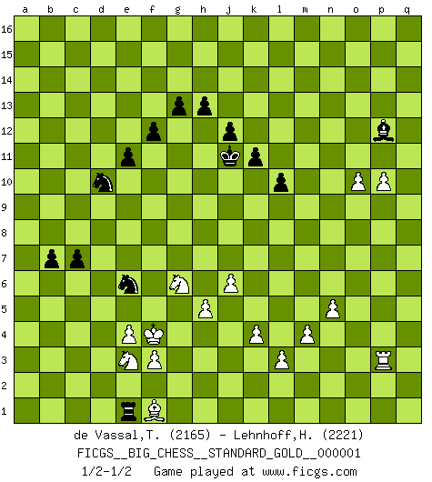 Last move : 1/2-1/2 2016 March 10 23:13:4 [Event "FICGS__BIG_CHESS__STANDARD_GOLD__000001"] [Site "FICGS"] [Date "2014.10.14"] [Round "1"] [White "de Vassal,Thibault"] [Black "Lehnhoff,Heinz-Georg"] [Result "1/2-1/2"] [WhiteElo "2165"] [BlackElo "2221"] 1.j2-k4 m15-m13 2.h1-o7 h15-g13 3.h2-g4 j15-k13 4.e2-e4 e15-e13 5.m2-m4 d15-d13 6.b1-c3 f16-b12 7.g1-j2 c15-c13 8.p1-o3 b16-c14 9.l1-p5 k16-h15 10.f1-b5 h16-l13 11.n2-n3 p16-q14 12.d2-d3 n15-n13 13.o7-q7 g16-j15 14.q7-n4 m13-m12 15.n4-d13 c16-f13 16.q2-q4 l16-p12 17.k1-h2 o15-o13 18.o1-f9 a16-d16 19.d13-l6 l13-l6 20.k4-l6 o16-f8 21.h2-j4 h15-j13 22.c1-h6 j16-h15 23.e1-e3 f13-g14 24.h6-f8 b12-f8 25.e3-f3 f8-b12 26.c3-d5 d16-d6 27.j2-k4 e13-e12 28.a1-e1 c14-d12 29.f3-f7 d12-f11 30.e1-e3 a15-a14 31.e3-f3 m16-m13 32.m1-m3 l15-l14 33.m3-l3 d6-d8 34.o3-n5 m13-l13 35.l3-l5 q16-m16 36.l5-m5 f15-f14 37.q1-q3 e16-d16 38.q3-o3 f11-d10 39.f9-d7 g13-f11 40.f7-n7 n13-n12 41.m5-m7 m12-m11 42.p5-o6 p12-o11 43.o6-p7 k13-m12 44.o3-o8 d8-o8 45.p7-o8 l13-l8 46.o8-q6 q14-p12 47.m7-m8 p15-p14 48.n7-h7 j13-k11 49.m8-l8 o11-l8 50.f3-f6 k11-j9 51.h7-h8 m12-l10 52.l6-k8 l8-n10 53.k8-l10 j9-l10 54.a2-a4 j15-k13 55.p2-p4 d10-c12 56.f6-g6 c12-e13 57.c2-c4 f11-e9 58.d7-e6 e13-f11 59.e6-j10 e9-d7 60.b2-b4 d7-f8 61.g6-b6 d16-d12 62.j10-o5 m16-d16 63.b5-h11 d12-d6 64.b6-d6 d16-d6 65.q6-p5 b15-b14 66.h11-b5 a14-a13 67.p5-l9 f8-e6 68.l9-h6 e6-d4 69.h6-b12 a13-b12 70.b5-f9 d6-d9 71.f9-j6 n10-j6 72.k4-j6 k13-h12 73.h8-a8 e12-e11 74.a8-a16 b14-b13 75.a16-p16 h15-j15 76.p16-b16 j15-h15 77.b16-c16 c13-c12 78.c16-b16 f11-d12 79.o5-n6 c12-c11 80.j4-g5 d4-c2 81.a4-a5 c2-e1 82.g4-e5 e1-g2 83.j1-h2 g2-e1 84.h2-g1 e1-c2 85.g5-f3 g14-d11 86.j6-g5 d11-c12 87.g1-f1 d9-e9 88.g5-f7 e9-n9 89.n6-k3 c12-j6 90.h3-h4 n9-h9 91.j3-j4 l10-k8 92.h4-h5 j6-n10 93.f1-e2 h9-b9 94.b4-b5 c2-a3 95.f3-d4 k8-h7 96.e2-d2 n10-o9 97.e5-g4 b9-f9 98.f7-h6 h7-g5 99.d5-e7 f9-e9 100.e7-f5 g5-e4 101.d3-e4 a3-c4 102.d2-d3 c4-a5 103.b16-a16 a5-b7 104.f2-f3 e9-c9 105.a16-d16 h12-f13 106.d16-q16 q15-q14 107.q16-p16 p14-p13 108.p16-a16 b7-a9 109.a16-e16 o9-n8 110.e16-e12 a9-c10 111.e12-k12 h15-j15 112.k12-k8 n8-l10 113.q4-q5 k15-k13 114.o2-o4 j14-j13 115.q5-q6 k13-k12 116.p4-p5 l14-l13 117.k8-l8 l13-l12 118.h6-k7 l12-l11 119.l8-l9 c9-c7 120.k7-m8 l10-j12 121.l9-q9 c7-c8 122.m8-o9 o13-o12 123.o9-q10 p12-n13 124.q9-p9 j12-m15 125.g4-h6 f13-h12 126.p9-p8 c8-c9 127.p8-g8 g15-g13 128.q10-p8 n12-n11 129.p8-o6 f14-f13 130.o6-m7 m15-n14 131.g8-a8 c10-a11 132.p5-p6 f13-f12 133.n3-n4 m11-m10 134.o4-o5 o12-o11 135.q6-q7 n11-n10 136.q7-q8 p13-p12 137.p6-p7 n10-n9 138.n5-l6 c9-c7 139.l6-n5 q14-q13 140.o5-o6 h12-f11 141.m7-l5 f11-d10 142.n5-l6 n14-c4 143.d3-e3 c4-h9 144.l6-j5 c7-c1 145.h6-k7 q13-q12 146.n4-n5 p12-p11 147.f5-g7 h9-g10 148.g7-e6 o11-o10 149.k7-j9 g10-j12 150.j9-l8 p11-p10 151.e3-f4 j15-j14 152.f4-g5 o10-o9 153.a8-a9 j12-g10 154.l8-n9 m10-n9 155.a9-n9 n13-m11 156.n9-n14 j14-j15 157.n14-q14 d10-e8 158.q14-q12 e8-d6 159.l5-m7 d6-b5 160.m7-o8 b5-d4 161.e6-d4 g10-l14 162.q12-q14 j15-k15 163.q14-p14 m11-n9 164.d4-f5 b12-b11 165.f5-g3 b11-b10 166.k3-n6 h14-h13 167.p14-p15 k15-j14 168.p15-d15 a11-c10 169.d15-d14 j14-k13 170.d14-d13 d12-f11 171.d13-b13 c10-d12 172.b13-b12 j13-j12 173.b12-b15 k13-j13 174.n6-k9 l11-l10 175.k9-j8 k12-k11 176.j8-k7 j13-h12 177.b15-p15 b10-b9 178.k7-p12 h12-j11 179.p12-q11 c1-c8 180.o8-p10 c8-p8 181.q8-q9 p8-p9 182.p15-p14 l14-m13 183.p14-m14 n9-p10 184.q9-p10 m13-k15 185.m14-o14 c11-c10 186.p10-p11 o9-o8 187.o14-o8 p9-p11 188.o8-q8 p11-m11 189.q8-q4 m11-m9 190.p7-p8 b9-b8 191.q4-p4 c10-c9 192.p8-p9 b8-b7 193.g3-f5 c9-c8 194.j5-g6 d12-c10 195.j4-j5 k15-j14 196.l2-l3 f11-d10 197.q11-f1 j14-n10 198.p9-p10 m9-h9 199.j5-j6 n10-p12 200.o6-o7 h9-k9 201.k2-k4 k9-l9 202.p4-p3 c8-c7 203.o7-o8 l9-a9 204.o8-o9 a9-a1 205.f5-e3 c10-d8 206.o9-o10 a1-e1 207.g5-f4 d8-e6 1/2-1/2 Follow this game move after move (download)The game of Chess is not merely an idle amusement; several very valuable qualities of the mind are to be acquired and strengthened by it, so as to become habits ready on all occasions; for life is a kind of Chess. (Benjamin Franklin) Ich bin stolz ein Bulgare zu sein. (Veselin Topalov) Una buena memoria, concentración, imaginación y una fuerte voluntad, se requiere para llegar a ser un buen jugador. (Bobby Fischer) Le système Elo représente seulement une moyenne. Il est simplement un indicateur de votre stabilité. (Anatoli Karpov) The general who wins the battle makes many calculations in his temple before the battle is fought. The general who loses makes but few calculations beforehand. (Sun Tzu)