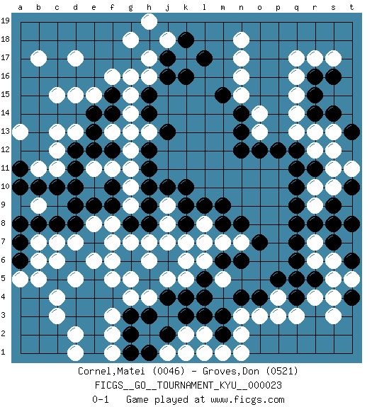 Last move : 0-1 2007 May 17 10:1:59 [Event "FICGS__GO__TOURNAMENT_KYU__000023"] [Site "FICGS"] [Date "2007.02.21"] [Round "1"] [Black "Cornel,Matei"] [White "Groves,Don"] [Result "0-1"] [Rating 1 "0046"] [Rating 2 "0521"] 1.k10 d17 2.d4 q16 3.k16 r4 4.p5 p3 5.o4 o3 6.n4 n3 7.m3 r6 8.q8 c15 9.q6 r7 10.r8 c6 11.d6 c3 12.c5 c7 13.d8 d7 14.e7 c4 15.c8 b5 16.b8 b7 17.a7 b6 18.a6 d5 19.e5 e6 20.e4 f6 21.f7 f5 22.f4 g4 23.g3 h4 24.h3 g7 25.g8 h7 26.h8 r13 27.j4 j5 28.k4 k5 29.l5 j8 30.k8 j9 31.j7 k7 32.j6 k6 33.h5 g5 34.l7 h6 35.k9 l6 36.m6 g9 37.h9 f8 38.h10 e8 39.j10 j7 40.f9 g10 41.e9 g11 42.q4 q3 43.r5 s5 44.q7 q5 45.d3 h16 46.h15 g15 47.h14 g14 48.h12 g12 49.g13 f13 50.j13 e11 51.j16 h17 52.d10 c9 53.c10 b9 54.b10 a9 55.a10 a5 56.d9 c11 57.h18 g18 58.d11 c12 59.d12 d13 60.e12 f11 61.a8 b9 62.f12 h13 63.h11 g13 64.e13 c13 65.e14 e15 66.f15 f16 67.f14 d15 68.f10 g16 69.j17 j18 70.k18 h19 71.l17 m5 72.l4 m7 73.n6 l8 74.m9 n7 75.l9 r9 76.q10 s8 77.o7 r10 78.q12 r12 79.r11 s11 80.q11 r17 81.r5 p4 82.q5 s3 83.m8 l7 84.n8 n17 85.q9 q13 86.s7 s6 87.s9 s10 88.t8 s12 89.s8 n15 90.n14 o14 91.n13 o13 92.n12 b11 93.a11 a13 94.t6 t5 95.t10 t11 96.m2 n2 97.p12 m1 98.l1 n1 99.o12 l2 100.k1 k2 101.j2 j1 102.h1 k1 103.l3 d2 104.e2 d1 105.e1 f3 106.e3 f2 107.k3 l1 108.e7 f7 109.m15 n16 110.r15 q15 111.s16 s17 112.s14 n18 113.r14 q14 114.t13 s13 115.r16 q17 116.g1 f1 117.g2 b17 118.t4 s4 0-1 Here are the names of the openings (joseki) played in the four corners : Corner q4 : r4 p5 Komoku (Somok, Xiao~mu`) 3-4 Point. The komoku (3-4) point is the traditional corner enclosure move.. Corner d4 : d4 c6 Hoshi (Hwajeom, Seongjeom, Xingwei`) 4-4 Point. The star or hoshi (4-4) point, emphasizing influence at the potential expense of territory. Ikken Kakari (Hankan Keolch'im, Yi Gua`jiao~, 1-Space Low Approach). White 2 is the standard approach move to the 4-4. Player White won this Go (weiqi, baduk) game. Follow this game move after move (download)Proverbs do not apply to White. (Tero Sand) I would love to change the world, but they won't give me the source code. (Unknown)