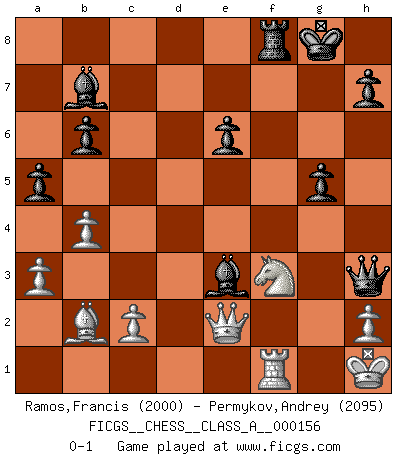 Last move : 0-1 2014 December 16 15:1:35 [Event "FICGS__CHESS__CLASS_A__000156"] [Site "FICGS"] [Date "2014.10.15"] [Round "1"] [White "Ramos,Francis"] [Black "Permykov,Andrey"] [Result "0-1"] [WhiteElo "2000"] [BlackElo "2095"] 1.d4 d5 2.Nf3 Nf6 3.e3 e6 4.Bd3 c5 5.b3 Be7 6.Bb2 cxd4 7.exd4 O-O 8.O-O Nbd7 9.Nbd2 b6 10.Ne5 Bb7 11.f4 Ne4 12.f5 Nxe5 13.dxe5 Bc5+ 14.Kh1 Qg5 15.Bxe4 dxe4 16.Qe2 exf5 17.Rad1 Rfe8 18.a3 a5 19.Nc4 f4 20.Nd2 Qf5 21.Rde1 f3 22.gxf3 exf3 23.Nxf3 g5 24.Qd3 Qh3 25.e6 Rxe6 26.Rxe6 fxe6 27.b4 Be3 28.Qe2 Rf8 0-1 Queen's pawn game, Rubinstein (Colle-Zukertort) variation Kingside Castling by player Black (move 7) Kingside Castling by player White (move 8) Player Black won this chess game. Follow this game move after move (download)Is Bobby Fischer quite sane ? (Salo Flohr) Wenn Schach ein enormer Dschungel ist, der seine Myriaden von Geheimnissen nicht preisgeben will, dann sind Computer die Kettensägen einer gewaltigen ökologisch unsensiblen Nutzholzfirma. (Nigel Short) Buenas posiciones no logran ganar juegos, buenas movidas sí. (Gerald Abrahams) La victoire dans une partie d'Echecs appartient la plupart du temps à celui qui voit un peu plus loin que l'adversaire. (Lasker) Patience, use the Force, think ! (Obi-Wan Kenobi in Star Wars ep.2)