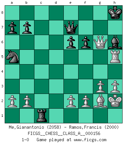 Last move : 1-0 2015 January 11 13:27:21 [Event "FICGS__CHESS__CLASS_A__000156"] [Site "FICGS"] [Date "2014.10.15"] [Round "1"] [White "Me,Gianantonio"] [Black "Ramos,Francis"] [Result "1-0"] [WhiteElo "2058"] [BlackElo "2000"] 1.d4 d5 2.Nf3 e6 3.c4 c5 4.cxd5 exd5 5.Nc3 Nc6 6.g3 Nf6 7.Bg2 Be7 8.O-O O-O 9.Bg5 cxd4 10.Nxd4 h6 11.Be3 Re8 12.Rc1 Bf8 13.Qb3 Na5 14.Qc2 Bg4 15.h3 Be6 16.Rfd1 Rc8 17.Nxe6 fxe6 18.Qg6 Kh8 19.Ne4 Rxc1 20.Bxc1 Qe7 21.Nxf6 gxf6 22.Rd4 Rc8 23.Bxh6 Rc4 24.Rxd5 Rc1+ 25.Kh2 Bxh6 26.Rh5 1-0 Queen's pawn game Kingside Castling by player White (move 8) Kingside Castling by player Black (move 8) Player White won this chess game. Follow this game move after move (download)No price is too great for the scalp of the enemy King. (Koblentz) Im Internet Chess Club betrug mein Rating vorübergehend 3350 ELO-Punkte. (Sergej Karjakin) De eso se trata el Ajedrez. Un día le das una lección a tu oponente y al día siguiente el te da una a tí. (Bobby Fischer) Le jeu d'échecs fait naître et fortifie en nous plusieurs qualités précieuses dans le cours de l'existence, telles que la prévoyance, la circonspection, la prudence, et la persévérance. (Benjamin Franklin - 1783, la morale des échecs) I don't know, I don't care, and it doesn't make any difference. (Albert Einstein)