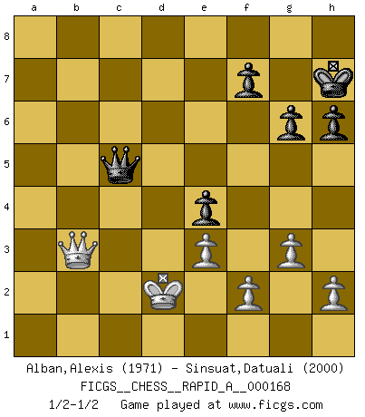 Last move : 1/2-1/2 2015 February 11 9:56:41 [Event "FICGS__CHESS__RAPID_A__000168"] [Site "FICGS"] [Date "2014.10.15"] [Round "1"] [White "Alban,Alexis"] [Black "Sinsuat,Datuali"] [Result "1/2-1/2"] [WhiteElo "1971"] [BlackElo "2000"] 1.d4 Nf6 2.c4 e6 3.Nf3 d5 4.Nc3 c6 5.e3 Nbd7 6.Qc2 Bd6 7.Bd2 O-O 8.O-O-O b5 9.cxb5 Bb7 10.bxc6 Bxc6 11.Kb1 Rb8 12.Bd3 Qb6 13.Ng5 h6 14.Nh7 Rfc8 15.Nxf6+ Nxf6 16.Rc1 Ne4 17.Nxe4 dxe4 18.Be2 Ba3 19.Qb3 Bxb2 20.Kxb2 Qc7 21.Bb4 a5 22.Rc4 Qd7 23.Rhc1 Rd8 24.Qc3 Bd5 25.Rc7 Qa4 26.Bc4 Bxc4 27.Rxc4 axb4 28.Qb3 Qa5 29.g3 g6 30.Rc5 Qa6 31.Rc6 Qa8 32.R1c5 Kg7 33.Kb1 Rd5 34.Rxd5 Qxc6 35.Rc5 Qa6 36.d5 exd5 37.Qxd5 b3 38.Qe5+ Kh7 39.Qxb8 Qxa2+ 40.Kc1 Qa3+ 41.Kd2 Qxc5 42.Qxb3 1/2-1/2 Queen's pawn game Kingside Castling by player Black (move 7) Queenside Castling by player White (move 8) This chess game ended in a draw. Follow this game move after move (download)In order to improve your game, you must study the endgame before everything else, for whereas the endings can be studied and mastered by themselves, the middle game and the opening must be studied in relation to the endgame. (Jose Raul Capablanca) Ich kämpfe solange mein Gegner einen Fehler machen kann. (Emanuel Lasker) Puntos débiles o agujeros en la posición de tu oponente deben de ser ocupados por piezas, no Peones. (Siegbert Tarrasch) Des combinaisons [dans le jeu d'échecs] pareilles à des mélodies. Je crois entendre pour ainsi dire la musique des coups... (Vladimir Nabokov) Gambling is the son of avarice and the father of despair. (French proverb)