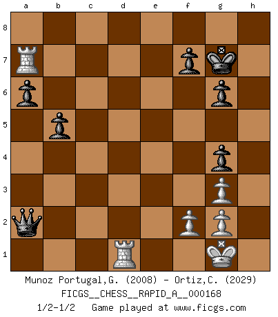 Last move : 1/2-1/2 2014 November 28 0:32:26 [Event "FICGS__CHESS__RAPID_A__000168"] [Site "FICGS"] [Date "2014.10.15"] [Round "1"] [White "Munoz Portugal,Guillermo"] [Black "Ortiz,Clodomiro"] [Result "1/2-1/2"] [WhiteElo "2008"] [BlackElo "2029"] 1.e4 e5 2.Nf3 Nf6 3.Nxe5 d6 4.Nf3 Nxe4 5.d4 d5 6.Bd3 Bd6 7.O-O O-O 8.c4 c6 9.Re1 Bf5 10.Nc3 Nxc3 11.bxc3 Bxd3 12.Qxd3 dxc4 13.Qxc4 Qc7 14.Bg5 h6 15.Bh4 Nd7 16.Qe2 Nb6 17.Bg3 Bxg3 18.hxg3 c5 19.Rab1 Rfd8 20.Qb5 cxd4 21.cxd4 Qd6 22.Re2 Nd5 23.Rc2 Rd7 24.Rbc1 Re7 25.Qb1 Rae8 26.a4 Nf6 27.a5 a6 28.Qb2 g6 29.Ne5 h5 30.Rf1 Ng4 31.Nxg4 hxg4 32.Rc2c1 Qf6 33.Qd2 Rd8 34.Rc4 Rd5 35.Qc3 Kg7 36.Rb4 Qc6 37.Rc4 Qd6 38.Rc5 Rxd4 39.Rc4 R7e4 40.Rd1 Qa3 41.Rc4xd4 Qxc3 42.Rxe4 Qxa5 43.Re7 b5 44.Ra7 Qa2 1/2-1/2 Petrov : Classical attack, Marshall variation Kingside Castling by player White (move 7) Kingside Castling by player Black (move 7) This chess game ended in a draw. Follow this game move after move (download)For me, Chess is life and every game is like a new life. Every Chess player gets to live many lives in one lifetime. (Eduard Gufeld) Stelle das Brett so, daß die Sonne in die Augen deines Gegners scheint. (Ruy López) Yo siempre he tenido un ligero sentimiento de lástima por una persona que no tiene conocimiento del Ajedrez. (Siegbert Tarrasch) Les écrivains ont utilisé les échecs pour analyser les côtés extrêmes de la nature humaine. Dans ce cadre, les échecs offrent un champ d'expérimentation idéal. Mais on pourrait faire la même chose avec la peinture. Et là, en vous référant à Van Gogh, vous ne tirerez pas de conclusion définitive sur les peintres. (Gary Kasparov) Live, lose, and learn, by observing your opponent how to win. (Amber Steenbock)