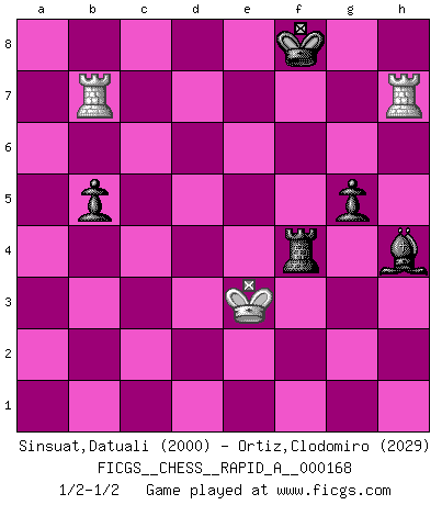 Last move : 1/2-1/2 2014 October 31 7:22:53 [Event "FICGS__CHESS__RAPID_A__000168"] [Site "FICGS"] [Date "2014.10.15"] [Round "1"] [White "Sinsuat,Datuali"] [Black "Ortiz,Clodomiro"] [Result "1/2-1/2"] [WhiteElo "2000"] [BlackElo "2029"] 1.e4 e5 2.Nf3 Nc6 3.Bb5 a6 4.Ba4 Nf6 5.O-O Be7 6.Re1 b5 7.Bb3 d6 8.c3 O-O 9.h3 Nd7 10.d4 Na5 11.Bc2 c5 12.Nbd2 exd4 13.cxd4 Nc6 14.d5 Nce5 15.a4 Bb7 16.Nxe5 Nxe5 17.Qe2 Rb8 18.f4 Ng6 19.Nf3 Bf6 20.e5 Be7 21.Rd1 dxe5 22.axb5 axb5 23.Bxg6 hxg6 24.d6 Bxf3 25.Qxf3 Bf6 26.Be3 exf4 27.Bxc5 Qc8 28.Rac1 Qd7 29.Bd4 Qxd6 30.Bc5 Qe5 31.Bxf8 Rxf8 32.b4 Qe3+ 33.Qxe3 fxe3 34.Kf1 Ra8 35.Ke2 Ra2+ 36.Kf3 Bg5 37.Rf1 Rb2 38.Rc5 e2 39.Re1 Bh4 40.Rxe2 Rxb4 41.Rc8+ Kh7 42.Rf8 f5 43.g4 fxg4+ 44.hxg4 Rb3+ 45.Re3 Rb2 46.R3e8 g5 47.Rh8+ Kg6 48.Re6+ Kf7 49.Rhe8 Rf2+ 50.Ke3 Rg2 51.R8e7+ Kf8 52.Rb7 Rxg4 53.R6e7 Rf4 54.Red7 Kg8 55.Rxg7+ Kf8 56.Rh7 Kg8 57.Rbg7+ Kf8 58.Rb7 Kg8 59.Rbg7+ Kf8 60.Rb7 1/2-1/2 Ruy Lopez : Closed Kingside Castling by player White (move 5) Kingside Castling by player Black (move 8) 10 pieces endgame at move 44 : White KRRP , Black KRBPPP WHITE : King + 2 Rooks 1 Pawn BLACK : King + 1 Rook 1 Bishop 3 Pawns 9 pieces endgame at move 52 : White KRR , Black KRBPPP WHITE : King + 2 Rooks BLACK : King + 1 Rook 1 Bishop 3 Pawns 8 pieces endgame at move 55 : White KRR , Black KRBPP WHITE : King + 2 Rooks BLACK : King + 1 Rook 1 Bishop 2 Pawns This chess game ended in a draw. Follow this game move after move (download)Chess problems demand from the composer the same virtues that characterize all worthwhile art: originality, invention, conciseness, harmony, complexity, and splendid insincerity. (Vladimir Nabokov) Unter Putin wird alles Geld aus Russland wie von einem Staubsauger nach Moskau umgeleitet, das ist wie ein schwarzes Loch. (Garry Kasparov) El Ajedrez expande y enriquece tu mente. (Saudin Robovic) Les Echecs ont trois composantes : le temps, l'espace et le matériel en dernier. (Mikhail Tal) Everything in life is luck. (Donald Trump)
