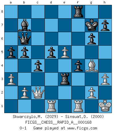 Last move : 0-1 2014 November 6 9:43:5 [Event "FICGS__CHESS__RAPID_A__000168"] [Site "FICGS"] [Date "2014.10.15"] [Round "1"] [White "Skwarczylo,Marek"] [Black "Sinsuat,Datuali"] [Result "0-1"] [WhiteElo "2029"] [BlackElo "2000"] 1.d4 Nf6 2.Nf3 b6 3.c4 Bb7 4.Nc3 e6 5.a3 d5 6.cxd5 Nxd5 7.Bd2 Nd7 8.Nxd5 exd5 9.Bf4 c5 10.e3 c4 11.Be2 Be7 12.O-O O-O 13.Qc2 Nf6 14.Ne5 b5 15.h3 Ne4 16.Bg4 a5 17.Bf5 g6 18.Bd7 f6 19.Be6+ Kg7 20.Nd7 Re8 21.f3 Ng5 22.Bxg5 fxg5 23.Bg4 Bd6 24.f4 Rxe3 25.Ne5 Qb6 26.Rad1 gxf4 27.Kh1 Bxe5 28.dxe5 Rf8 0-1 Queen's Indian defense Kingside Castling by player White (move 12) Kingside Castling by player Black (move 12) Player Black won this chess game. Follow this game move after move (download)Becoming successful at Chess allows you to discover your own personality. That's what I want for the kids I teach. (Saudin Robovic) Die unerbitterlichsten Regeln im Schach sind die Ausnahmen. (Savielly Grigorievitsch Tartakower) Preferería tener un Peón que un dedo. (Reuben Fine) Il vaut toujours mieux jouer un plan faux de façon logique que de n'avoir pas de plan du tout. (Victor Kortchnoï) Unless in communicating with it one says exactly what one means, trouble is bound to result. (Alan Turing, about computers)