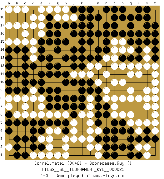 Last move : 1-0 2007 October 22 21:19:26 [Event "FICGS__GO__TOURNAMENT_KYU__000023"] [Site "FICGS"] [Date "2007.02.21"] [Round "1"] [Black "Cornel,Matei"] [White "Sobrecases,Guy"] [Result "1-0"] [Rating 1 "0046"] 1.k10 f14 2.k14 h12 3.j13 o6 4.j12 n11 5.h11 f10 6.g12 g13 7.h13 g14 8.f12 e12 9.e9 d8 10.e11 e10 11.d10 d11 12.f11 g10 13.d12 g4 14.e13 h10 15.c11 e8 16.f9 g9 17.f8 e7 18.g8 j9 19.h8 j11 20.j10 h9 21.k8 k11 22.k9 m10 23.j8 l11 24.g11 m12 25.m13 n13 26.l13 o12 27.n14 o14 28.f15 o15 29.p13 o13 30.l10 m14 31.n15 m15 32.n16 m16 33.o16 p15 34.p16 r16 35.q15 p12 36.q13 q12 37.r14 p14 38.q16 q14 39.r13 r12 40.r15 l14 41.k13 n17 42.o17 m17 43.o18 n18 44.k16 l16 45.k17 j15 46.k15 l17 47.k18 l18 48.l19 l12 49.e14 h14 50.g15 n9 51.j16 o10 52.m8 n8 53.m9 l7 54.m7 l6 55.m6 l5 56.m5 l4 57.o5 o8 58.n6 o7 59.p5 p6 60.r5 m4 61.n4 q6 62.r6 q5 63.q4 l8 64.r7 o3 65.n3 o2 66.n2 p3 67.q3 p4 68.o4 p1 69.q2 r8 70.q7 q8 71.q1 m2 72.l9 s13 73.n1 l2 74.p2 k3 75.o1 j3 76.h5 h6 77.g5 g6 78.f5 f6 79.j6 j5 80.j7 j4 81.e5 e6 82.d5 d6 83.c5 c6 84.b5 b6 85.a6 c7 86.c9 c8 87.b9 b8 88.h15 f4 89.e4 e3 90.d3 c4 91.d4 c3 92.d2 c2 93.e2 f3 94.c1 a7 95.a5 b4 96.j14 f2 97.f1 g1 98.b2 e1 99.b3 f1 100.a4 d17 101.n19 e16 102.f17 e17 103.f16 d15 104.f13 c15 105.m18 m19 106.o19 k19 107.j19 j18 108.l19 h19 109.k19 h18 110.m18 e18 111.l15 g18 112.f18 f19 113.g17 e19 114.e15 d14 115.c13 c16 116.c14 b15 117.b14 a15 118.a14 r17 119.s15 s12 120.s8 s9 121.h4 h3 122.f7 a8 123.a9 s7 124.h17 t8 125.p7 p8 126.s6 t6 127.t5 t7 128.r10 d9 129.s10 t10 130.t11 t9 131.r9 s8 132.s11 r11 133.q10 p10 134.t13 t12 135.j17 g19 136.t14 q11 137.m3 l3 138.k12 s17 139.q17 q18 140.s18 t18 141.s16 r18 142.p18 q19 143.s19 r19 144.t16 q9 145.p19 t19 146.t17 r4 147.s4 s5 148.r3 r5 149.s3 t4 150.t3 t5 151.s19 d13 152.g14 m1 153.m14 b12 154.c12 b11 155.c10 g10 156.h10 f10 157.e10 b10 158.g9 s14 159.t15 m16 160.s18 k6 161.k7 d1 162.c3 m17 163.n17 a10 164.a13 b13 165.a12 r17 166.r18 m15 167.a11 b17 168.g7 p3 169.h7 o3 170.p4 l17 171.l18 s2 172.l16 h2 173.o2 s1 174.n7 p3 175.o3 h1 176.r16 q19 177.c18 c17 178.b18 a17 179.a18 c19 180.d19 d18 181.s17 h16 182.g16 b19 183.pass pass 184.pass pass 185.r19 m17 186.q18 t11 187.m16 a19 188.l17 r2 189.r1 b10 190.b11 a2 191.b1 pass 192.pass pass 193.a10 1-0 Here are the names of the openings (joseki) played in the four corners : Corner d4 : e9 d8 This joseki is unknown. A weak or weird move has probably been played in this corner. Player Black won this Go (weiqi, baduk) game. Follow this game move after move (download)Learning josekis by heart is useless if you don't try departing from them. (Pierre Audouard) Information on the Internet is subject to the same rules and regulations as conversation at a bar. (George Lundberg)