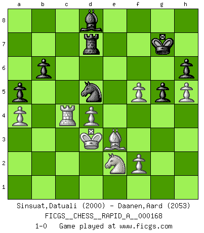 Last move : 1-0 2014 November 1 20:10:22 [Event "FICGS__CHESS__RAPID_A__000168"] [Site "FICGS"] [Date "2014.10.15"] [Round "1"] [White "Sinsuat,Datuali"] [Black "Daanen,Aard"] [Result "1-0"] [WhiteElo "2000"] [BlackElo "2053"] 1.e4 e5 2.Nf3 Nf6 3.Nxe5 d6 4.Nf3 Nxe4 5.d4 d5 6.Bd3 Nc6 7.O-O Be7 8.Nc3 Bf5 9.Re1 Nxc3 10.bxc3 Bxd3 11.Qxd3 O-O 12.c4 dxc4 13.Qxc4 Qd7 14.Bd2 Rad8 15.c3 Rfe8 16.Qd3 h6 17.h3 Bd6 18.Qb5 b6 19.Rxe8+ Rxe8 20.a4 Rd8 21.Re1 Na5 22.Qxd7 Rxd7 23.Re8+ Kh7 24.Kf1 c5 25.Ke2 cxd4 26.cxd4 Nc6 27.Kd3 f6 28.g4 Kg6 29.Rc8 Ne7 30.Ra8 Kf7 31.Nh4 g6 32.Nf3 g5 33.Ke4 a5 34.Be3 Bc7 35.Ng1 Bd6 36.Ne2 Bb4 37.h4 Nd5 38.h5 f5+ 39.gxf5 Be7 40.Kd3 Kf6 41.Rh8 Kg7 42.Rc8 Bd8 43.Rc4 1-0 Petrov : Classical attack Kingside Castling by player White (move 7) Kingside Castling by player Black (move 11) Player White won this chess game. Follow this game move after move (download)Chess demands total concentration. (Bobby Fischer) Ein Springer auf f6 gegen die eigene Rochadestellung ist schlimmer als ein rostiger Nagel im Knie. (Efim Bogoljubov) El Ajedrez es de 30 a 40 por ciento psicología. Uno no cuenta con esto cuando se juega contra una computadora. No lo puedo confundir. (Judith Polgar) On entre au jeu d'Echecs comme on entre en Religion. Pour le joueur d'Echecs, la partie d'Echecs c'est l'office, la messe, le défilé du 1er Mai, le dépôt de gerbe au Monument aux Morts. C'est un drame sacré. (Michel Roos) When you don't know what to do, walk fast and look worried. (Anonymous)