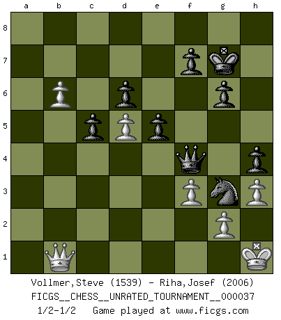 Last move : 1/2-1/2 2014 November 4 13:56:2 [Event "FICGS__CHESS__UNRATED_TOURNAMENT__000037"] [Site "FICGS"] [Date "2014.10.18"] [Round "1"] [White "Vollmer,Steve"] [Black "Riha,Josef"] [Result "1/2-1/2"] [WhiteElo "1539"] [BlackElo "2006"] 1.d4 Nf6 2.c4 g6 3.Nf3 Bg7 4.Nc3 O-O 5.e4 d6 6.Be2 e5 7.d5 a5 8.O-O Na6 9.Bg5 h6 10.Bc1 Nc5 11.Qc2 Bg4 12.Be3 Na6 13.h3 Bxf3 14.Bxf3 Qd7 15.Rad1 Rfe8 16.b3 Bf8 17.Be2 Nb4 18.Qd2 Kh7 19.a3 Na6 20.Bd3 Nc5 21.Bc2 a4 22.b4 Nb3 23.Qe2 Rec8 24.Bxb3 axb3 25.Qb2 h5 26.Qxb3 Kg8 27.a4 Bg7 28.Rfe1 Kh7 29.Bc1 Bh6 30.Bxh6 Kxh6 31.a5 Ra6 32.Ra1 Rca8 33.Ra2 b6 34.Rea1 Kg7 35.axb6 Rxa2 36.Rxa2 Rxa2 37.Qxa2 cxb6 38.f3 h4 39.Qa6 Qc7 40.Qb5 Nh5 41.Na4 Qd8 42.c5 Qg5 43.Qf1 Qe3+ 44.Qf2 Qc1+ 45.Kh2 Ng3 46.Qg1 Qf4 47.Qe1 bxc5 48.b5 Nxe4 49.Kg1 Ng3 50.b6 Qxa4 51.Qb1 Ne2+ 52.Kh2 Qf4+ 53.Kh1 Ng3+ 1/2-1/2 King's Indian, 3.Nf3 Kingside Castling by player Black (move 4) Kingside Castling by player White (move 8) This chess game ended in a draw. Follow this game move after move (download)There are two classes of men; those who are content to yield to circumstances and who play whist; those who aim to control circumstances, and who play Chess. (Mortimer Collins) Was ist der Unterschied zwischen einem Strassenarbeiter und einem Schachspieler? --Der Schachspieler bewegt sich ab und zu. (Anonymous) Uno no tiene que jugar muy bien, es suficiente jugar mejor que el oponente. (Siegbert Tarrasch) Les Echecs ne sont pas pour les âmes timides. Ils requièrent un homme entier, qui ne s'arrête pas aveuglément à ce qui a été déjà établi, mais qui tente individuellement de sonder les profondeurs du jeu. (W. Steinitz) A shortcut is the longest distance between two points. (Don Groves)