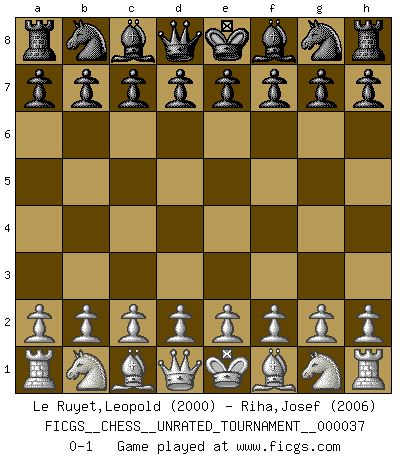 Last move : 0-1 2014 November 2 22:30:58 [Event "FICGS__CHESS__UNRATED_TOURNAMENT__000037"] [Site "FICGS"] [Date "2014.10.18"] [Round "1"] [White "Le Ruyet,Leopold"] [Black "Riha,Josef"] [Result "0-1"] [WhiteElo "2000"] [BlackElo "2006"] 0-1 Player Black won this chess game. Follow this game move after move (download)It's always better to sacrifice your opponent's men. (Savielly Tartakover) Wer wird heute Abend ihr Gegner sein? -- Heute Abend spiele ich gegen die schwarzen Steine. (Akiba Rubinstein) El Ajedrez se juega con la mente... ¡no con las manos!. (Renaud y Kahn) Des combinaisons [dans le jeu d'échecs] pareilles à des mélodies. Je crois entendre pour ainsi dire la musique des coups... (Vladimir Nabokov) When a man with money meets a man with experience, the man with experience leaves with money and the man with money leaves with experience. (Anonymous)