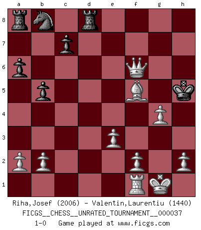 Last move : 1-0 2014 December 9 18:32:57 [Event "FICGS__CHESS__UNRATED_TOURNAMENT__000037"] [Site "FICGS"] [Date "2014.10.18"] [Round "1"] [White "Riha,Josef"] [Black "Valentin,Laurentiu"] [Result "1-0"] [WhiteElo "2006"] [BlackElo "1440"] 1.d4 d5 2.c4 e6 3.g3 Nf6 4.Bg2 g6 5.Nf3 Bg7 6.O-O O-O 7.Nc3 a6 8.cxd5 Nxd5 9.Nxd5 Qxd5 10.Bf4 Nc6 11.e3 Qd8 12.Rc1 Bd7 13.Rc5 h6 14.d5 exd5 15.Rxd5 Nb8 16.Bh3 f5 17.Qb3 b5 18.Rxd7 Kh8 19.Rxd8 Rxd8 20.Ne5 Kh7 21.Nxg6 Kxg6 22.Qe6+ Bf6 23.Bxf5+ Kg7 24.Bxh6+ Kxh6 25.Qxf6+ Kh5 26.g4+ 1-0 Queen's gambit declined Kingside Castling by player White (move 6) Kingside Castling by player Black (move 6) Player White won this chess game. Follow this game move after move (download)You are for me the Queen on d8 and I am the Pawn on d7 !! (Eduard Gufeld) Es ist besser die Steine des Gegners zu opfern. (Savielly Grigorievitsch Tartakower) El Ajedrez es un expediente tonto que hace creer a la gente inactiva que hacen una cosa muy astuta cuando solamente estan perdiendo su tiempo. (George Bernard Shaw) Shah mat. Le roi est mort. Cri de fierté d'un joueur venant de terrasser son adversaire, courtoisement, sans effusion de sang. Train yourself to let go of everything you fear to lose. (Master Yoda in Star Wars ep.3)