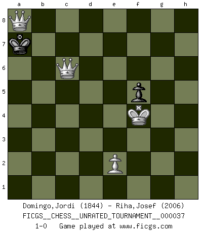 Last move : 1-0 2014 November 9 18:34:36 [Event "FICGS__CHESS__UNRATED_TOURNAMENT__000037"] [Site "FICGS"] [Date "2014.10.18"] [Round "1"] [White "Domingo,Jordi"] [Black "Riha,Josef"] [Result "1-0"] [WhiteElo "1844"] [BlackElo "2006"] 1.g4 e5 2.c4 d5 3.Bg2 dxc4 4.Nc3 Bd6 5.Qa4+ c6 6.Qxc4 Be6 7.Qd3 Na6 8.Bxc6+ bxc6 9.Qxa6 Ne7 10.Qa4 O-O 11.Nf3 Nd5 12.Rg1 Rb8 13.d3 Qc7 14.Ng5 Bc8 15.Qe4 Nf6 16.Qf3 Be7 17.Nce4 Nxg4 18.Rxg4 Bxg4 19.Qxg4 h6 20.Ne6 fxe6 21.Bxh6 Rf7 22.b3 Bb4+ 23.Kf1 Rbf8 24.Kg2 Ba3 25.Rg1 Rf5 26.Kh1 R8f7 27.Qg6 Kf8 28.Be3 Be7 29.Rg3 Qa5 30.Rh3 Qe1+ 31.Kg2 Bb4 32.Rh8+ Ke7 33.Bg5+ Kd7 34.Nf6+ R5xf6 35.Bxf6 Qxf2+ 36.Kxf2 Rxf6+ 37.Qxf6 gxf6 38.h4 Kd6 39.h5 Bc5+ 40.Kf3 Ke7 41.Rc8 Kf7 42.Rxc6 Bb6 43.b4 f5 44.Rxb6 axb6 45.a4 Kf6 46.a5 bxa5 47.bxa5 Kg5 48.a6 Kxh5 49.a7 Kg6 50.a8Q Kf7 51.Qa7+ Ke8 52.Qb8+ Kd7 53.Qxe5 Ke7 54.d4 Kf7 55.Kf4 Ke7 56.d5 Kd7 57.Qxe6+ Kc7 58.d6+ Kb8 59.d7 Kc7 60.Qe8 Kb7 61.d8Q Ka6 62.Qc6+ Ka7 63.Qd8a8+ 1-0 Grob's attack Kingside Castling by player Black (move 10) 10 pieces endgame at move 46 : White KPPPP , Black KPPPP WHITE : King + 4 Pawns BLACK : King + 4 Pawns 9 pieces endgame at move 47 : White KPPPP , Black KPPP WHITE : King + 4 Pawns BLACK : King + 3 Pawns 8 pieces endgame at move 48 : White KPPP , Black KPPP WHITE : King + 3 Pawns BLACK : King + 3 Pawns Promotion Queen by player White (move 50) 7 pieces endgame at move 53 : White KQPP , Black KPP WHITE : King + 1 Queen 2 Pawns BLACK : King + 2 Pawns 6 pieces endgame at move 57 : White KQPP , Black KP WHITE : King + 1 Queen 2 Pawns BLACK : King + 1 Pawn Promotion Queen by player White (move 61) Player White won this chess game. Follow this game move after move (download)Chess is a matter of delicate judgment, knowing when to punch and how to duck. (Bobby Fischer) Obwohl ich alt bin, darf mir niemand den Finger in den Mund stecken, sonst beisse ich. (Wilhelm Steinitz) Nunca antes ha habido un jugador de Ajedrez con tal conocimiento a fondo de las complejidades del juego y una inmensa voluntad absolutamente indomable de ganar. Yo pienso que Fischer es el jugador mas grande que jamás haya existido. (Lisa Lane) Avec des compensations pour le matériel en plus... (Anonyme) A belief is an idea the mind possesses, an idea that possesses the mind. (Robert Oxden Bolton)