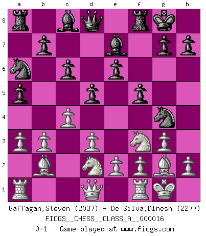 Last move : 0-1 2007 July 3 3:39:49 [Event "FICGS__CHESS__CLASS_A__000016"] [Site "FICGS"] [Date "2007.02.23"] [Round "1"] [White "Gaffagan,Steven"] [Black "De Silva,Dinesh"] [Result "0-1"] [WhiteElo "2037"] [BlackElo "2277"] 1.c4 f5 2.g3 Nf6 3.Bg2 e6 4.Nf3 c6 5.O-O d5 6.d3 Be7 7.b3 O-O 8.Bb2 a5 9.a3 Na6 10.Nbd2 Ng4 0-1 This chess game has been lost on time (started : 2007.02.23 0:30:14) English : Anglo-Dutch defense Kingside Castling by player White (move 5) Kingside Castling by player Black (move 7) Player Black won this chess game. Follow this game move after move (download)I don't believe in psychology. I believe in good moves. (Bobby Fischer) Stil? Ich habe keinen Stil! (Anatoly Karpov) Una mala movida nulifica cuarenta buenas. (Horowitz) Donnez-moi un Cavalier en 6e et je gagnerais toutes mes parties. (Steinitz) There are more things in heaven and earth than practically anywhere else. (Unknown)