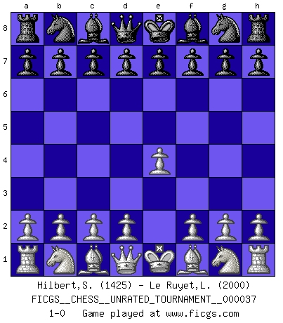 Last move : 1-0 2014 November 11 10:58:42 [Event "FICGS__CHESS__UNRATED_TOURNAMENT__000037"] [Site "FICGS"] [Date "2014.10.18"] [Round "1"] [White "Hilbert,Stephan J."] [Black "Le Ruyet,Leopold"] [Result "1-0"] [WhiteElo "1425"] [BlackElo "2000"] 1.e4 1-0 King's pawn Opening Player White won this chess game. Follow this game move after move (download)When you are lonely, when you feel yourself an alien in the world, play Chess. This will raise your spirits and be your counselor in war. (Aristotle) Wenn sie aufgeben, dann danke ich Ihnen für das Spiel (Eventualzug beim Fernschach). (Anonymous) El Ajedrez es tan interesante por sí solo, que no es necesario un interés monetario para persuadir a una persona a que lo practique; por lo tanto, nunca se juega por dinero. (Benjamin Franklin) On peut tirer plus d'utilité d'une partie perdue que de 100 parties gagnées. (Capablanca) Mandala - that's it! 16x16 squares as multiple of the four and the eight because of the Four Noble Truths and the Noble Eightfold Path. (Heinz-Georg Lehnhoff about Big Chess)