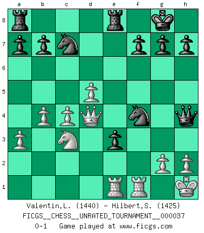 Last move : 0-1 2015 February 17 7:38:18 [Event "FICGS__CHESS__UNRATED_TOURNAMENT__000037"] [Site "FICGS"] [Date "2014.10.18"] [Round "1"] [White "Valentin,Laurentiu"] [Black "Hilbert,Stephan J."] [Result "0-1"] [WhiteElo "1440"] [BlackElo "1425"] 1.e4 e5 2.f4 exf4 3.Nf3 d5 4.exd5 Bd6 5.Bb5+ Bd7 6.Bxd7+ Qxd7 7.O-O Ne7 8.c4 O-O 9.d4 Ng6 10.Nc3 c5 11.dxc5 Bxc5+ 12.Kh1 Na6 13.a3 Nc7 14.b4 Be3 15.Bxe3 fxe3 16.Qd3 Rfe8 17.Rae1 Nf4 18.Qd4 Qg4 19.Nh4 Qxh4 0-1 This chess game has been lost on time (started : 2014.10.18 20:7:24) KGA : Abbazia defense (Classical defense, Modern defense!) Kingside Castling by player White (move 7) Kingside Castling by player Black (move 8) Player Black won this chess game. Follow this game move after move (download)There must have been a time when men were demigods, or they could not have invented Chess. (Gustav Schenk) Kann Schach nicht schließlich das Nationalspiel der Deutschen werden? Und welche weiteren Ausblicke bieten sich dann dar! Welche Hebung des allgemeinen Kultur-Niveaus, ja der Moral, wenn das Schachbrett den Kartentisch verdrängen würde! Wahrlich, ein Ziel, des Schweißes der Edlen wert! (Siegbert Tarrasch) No es una movida, aún la mejor movida que tu debas buscar, sino un plan comprensible. (Eugene Znosko-Borovsky) Il s'avisa de me proposer d'apprendre les échecs qu'il jouait un peu... me voilà forcené des échecs. J'achète un échiquier, je m'enferme dans ma chambre, j'y passe des jours et des nuits à vouloir apprendre par cur toutes les parties. (Jean-Jacques Rousseau, Confessions) Now you put water in a cup, it becomes the cup; You put water into a bottle it becomes the bottle; You put it in a teapot it becomes the teapot. Water can flow or it can crash. Be water, my friend. (Bruce Lee)