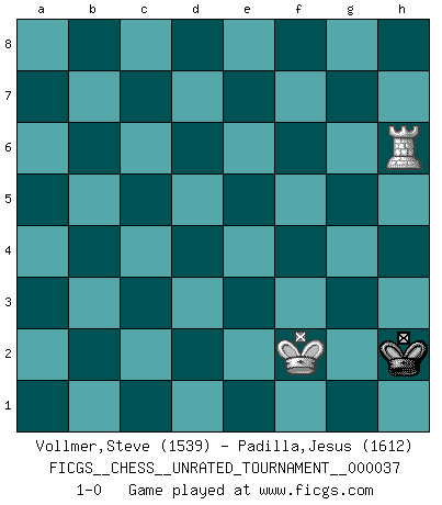 Last move : 1-0 2015 July 27 17:39:56 [Event "FICGS__CHESS__UNRATED_TOURNAMENT__000037"] [Site "FICGS"] [Date "2014.10.18"] [Round "1"] [White "Vollmer,Steve"] [Black "Padilla,Jesus"] [Result "1-0"] [WhiteElo "1539"] [BlackElo "1612"] 1.e4 c5 2.Nf3 d6 3.d4 cxd4 4.Nxd4 Nf6 5.Nc3 g6 6.Bc4 Bg7 7.O-O O-O 8.Bb3 Nc6 9.Be3 Bd7 10.f3 Rc8 11.Qd2 Ne5 12.Nd5 Nxd5 13.Bxd5 Qc7 14.c3 Nc4 15.Bxc4 Qxc4 16.Rfe1 Rfe8 17.Nb3 a6 18.Qd5 Qxd5 19.exd5 e6 20.dxe6 Bxe6 21.Rad1 Rcd8 22.Kf2 Bc4 23.Bf4 d5 24.Be3 Ra8 25.Nc1 Rad8 26.Bd4 Bxd4+ 27.Rxd4 Rxe1 28.Kxe1 Re8+ 29.Kf2 f5 30.b3 Bb5 31.Rxd5 Kf7 32.c4 Bc6 33.Rd2 Kf6 34.Ne2 Re7 35.Nf4 g5 36.Nd5+ Bxd5 37.Rxd5 h6 38.a4 Rc7 39.g3 Ke6 40.Ke3 Re7 41.Kd4 Kf6 42.Rd6+ Kg7 43.c5 Rc7 44.Kd5 h5 45.b4 Rf7 46.c6 bxc6+ 47.Kxc6 f4 48.gxf4 Rxf4 49.b5 axb5 50.axb5 Rxf3 51.b6 Rc3+ 52.Kd7 Rb3 53.Rc6 g4 54.Kc7 h4 55.b7 g3 56.hxg3 hxg3 57.b8Q Rxb8 58.Kxb8 Kf7 59.Rc1 Kf6 60.Rg1 Kf5 61.Rxg3 Kf4 62.Ra3 Ke5 63.Kc7 Ke6 64.Ra5 Kf6 65.Kd6 Kg6 66.Ke6 Kg7 67.Rg5+ Kh7 68.Kf6 Kh6 69.Rg1 Kh5 70.Rg2 Kh4 71.Kf5 Kh3 72.Rg4 Kh2 73.Kf4 Kh3 74.Kf3 Kh2 75.Rg6 Kh1 76.Kf2 Kh2 77.Rh6+ 1-0 Sicilian : Dragon variation Kingside Castling by player White (move 7) Kingside Castling by player Black (move 7) 10 pieces endgame at move 49 : White KRPPP , Black KRPPP WHITE : King + 1 Rook 3 Pawns BLACK : King + 1 Rook 3 Pawns 9 pieces endgame at move 50 : White KRPPP , Black KRPP WHITE : King + 1 Rook 3 Pawns BLACK : King + 1 Rook 2 Pawns 8 pieces endgame at move 50 : White KRPP , Black KRPP WHITE : King + 1 Rook 2 Pawns BLACK : King + 1 Rook 2 Pawns 7 pieces endgame at move 56 : White KRPP , Black KRP WHITE : King + 1 Rook 2 Pawns BLACK : King + 1 Rook 1 Pawn 6 pieces endgame at move 56 : White KRP , Black KRP WHITE : King + 1 Rook 1 Pawn BLACK : King + 1 Rook 1 Pawn Promotion Queen by player White (move 57) 5 pieces endgame at move 57 : White KR , Black KRP WHITE : King + 1 Rook BLACK : King + 1 Rook 1 Pawn 4 pieces endgame at move 58 : White KR , Black KP WHITE : King + 1 Rook BLACK : King + 1 Pawn 3 pieces endgame at move 61 : White KR , Black K WHITE : King + 1 Rook BLACK : King + Player White won this chess game. Follow this game move after move (download)That's what Chess is all about. One day you give your opponent a lesson, the next day he gives you one. (Bobby Fischer) Schach ist Krieg, im Schach geht es um testosterongesteuerte Urschreie. (Garry Kasparov) La vida es como un juego de Ajedrez, cambiando con cada movimiento. (Proverbio Chino) Il a essayé de se convaincre qu'il pourrait empêcher toutes les erreurs et ne jamais perdre. L'horreur ! Gary Kasparov au sujet de Robert Fischer. Animated gif is worth one mega-word. (Unknown)
