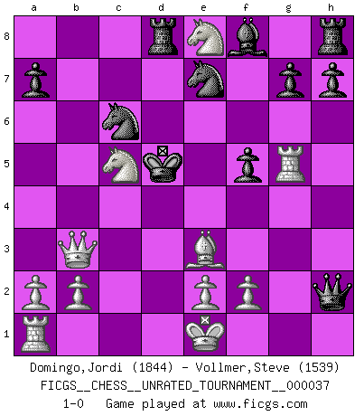Last move : 1-0 2014 October 21 19:3:34 [Event "FICGS__CHESS__UNRATED_TOURNAMENT__000037"] [Site "FICGS"] [Date "2014.10.18"] [Round "1"] [White "Domingo,Jordi"] [Black "Vollmer,Steve"] [Result "1-0"] [WhiteElo "1844"] [BlackElo "1539"] 1.g4 e5 2.c4 d5 3.Bg2 c6 4.cxd5 cxd5 5.Qb3 e4 6.Nc3 Ne7 7.d3 Nbc6 8.dxe4 dxe4 9.Bxe4 Be6 10.Qxb7 Rc8 11.Nf3 Qa5 12.Ng5 Bxg4 13.Rg1 Bf5 14.Bxf5 Qxf5 15.Nb5 Qe5 16.Ne4 Rd8 17.Nc7+ Kd7 18.Nc5+ Kd6 19.Be3 Qxh2 20.Ne8+ Kd5 21.Rg5+ f5 22.Qb3+ 1-0 Grob's attack Player White won this chess game. Follow this game move after move (download)Don't even mention losing to me. I can't stand to think of it. (Bobby Fischer) Offensichtlich kennt Kasparow nichts anderes als Schach, und ich könnte 500 weitere Spieler dieser Sorte benennen. (Judith Polgar) El Ajedrez es una guerra en un tablero. El objetivo es aplastar la mente del oponente. (Bobby Fischer) Donnez-moi un Cavalier en 6e et je gagnerais toutes mes parties. (Steinitz) Hold em is to stud what chess is to checkers. (Johnny Moss)