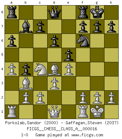 Last move : 1-0 2007 July 25 0:34:22 [Event "FICGS__CHESS__CLASS_A__000016"] [Site "FICGS"] [Date "2007.02.23"] [Round "1"] [White "Porkolab,Sandor"] [Black "Gaffagan,Steven"] [Result "1-0"] [WhiteElo "2000"] [BlackElo "2037"] 1.e4 e5 2.Nf3 Nc6 3.Bb5 a6 4.Ba4 Nf6 5.O-O b5 6.Bb3 Bc5 7.a4 Bb7 8.d3 b4 9.Nbd2 O-O 10.Nc4 d6 11.Be3 Bd4 12.Nxd4 Nxd4 13.Bxd4 1-0 This chess game has been lost on time (started : 2007.02.23 0:30:14) Ruy Lopez : 5.O-O Kingside Castling by player White (move 5) Kingside Castling by player Black (move 9) Player White won this chess game. Follow this game move after move (download)Bobby Fischer is the greatest Chess player who has ever lived. (Ken Smith) Im Internet Chess Club betrug mein Rating vorübergehend 3350 ELO-Punkte. (Sergej Karjakin) El Peón aislado arroja penumbra sobre todo el tablero. (Aaron Nimzovich) Les Echecs ont trois composantes : le temps, l'espace et le matériel en dernier. (Mikhail Tal) Luck is what you have left over after you give 100 percent. (Langston Coleman)
