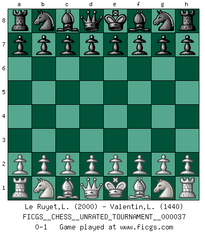 Last move : 0-1 2014 November 2 22:32:2 [Event "FICGS__CHESS__UNRATED_TOURNAMENT__000037"] [Site "FICGS"] [Date "2014.10.18"] [Round "1"] [White "Le Ruyet,Leopold"] [Black "Valentin,Laurentiu"] [Result "0-1"] [WhiteElo "2000"] [BlackElo "1440"] 0-1 Player Black won this chess game. Follow this game move after move (download)Who is your opponent tonight, tonight I am playing against the Black pieces. (Akiba Rubinstein) Gewinnen beim Schach fördert das Selbstvertrauen. Beim Sex spüre ich sowas nicht... (Garry Kasparov) Solo puedes ser bueno en el Ajedrez si amas al juego. (Bobby Fischer) Les échecs sont plus proches de l'art de l'assassinat que de l'art de la guerre. (Arturo Perez-Reverte) All men can see these tactics whereby I conquer, but what none can see is the strategy out of which victory is evolved. (Sun Tzu)