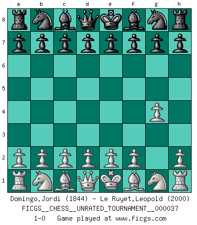 Last move : 1-0 2014 November 2 22:32:17 [Event "FICGS__CHESS__UNRATED_TOURNAMENT__000037"] [Site "FICGS"] [Date "2014.10.18"] [Round "1"] [White "Domingo,Jordi"] [Black "Le Ruyet,Leopold"] [Result "1-0"] [WhiteElo "1844"] [BlackElo "2000"] 1.g4 1-0 Grob's attack Player White won this chess game. Follow this game move after move (download)A great player and a great example for many. His book My 60 Memorable Games had a big impact on me. It is a shame he didn't continue to enrich the world of chess with his unparalleled understanding after 1972. (Jan Timman, about Bobby Fischer's death) Nach Morphy wurde nichts neues mehr in der Behandlung offener Positionen gefunden. (Mikhail Moiseyevich Botvinik) Aún el Rey más flojo huye despavorido ante la amenaza de un Jaque doble. (Aaron Nimzowitsch) Les échecs, c'est l'imagination. (David Bronstein) The bottom line is always the bottom line. (Johann Piek)