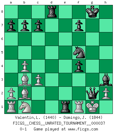 Last move : 0-1 2014 December 9 18:12:43 [Event "FICGS__CHESS__UNRATED_TOURNAMENT__000037"] [Site "FICGS"] [Date "2014.10.18"] [Round "1"] [White "Valentin,Laurentiu"] [Black "Domingo,Jordi"] [Result "0-1"] [WhiteElo "1440"] [BlackElo "1844"] 1.e4 e5 2.f4 exf4 3.Nf3 d6 4.Bc4 h6 5.O-O g5 6.b4 Bg7 7.c3 Nf6 8.e5 dxe5 9.Nxe5 O-O 10.d4 Nbd7 11.Ng6 Nb6 12.Bb3 Re8 13.Bb2 Nfd5 14.Ne5 Bxe5 15.dxe5 Ne3 16.Qh5 Nbd5 17.Re1 Bg4 18.Qxh6 Nf5 19.Qxg5+ Qxg5 20.Bxd5 Rad8 21.Bb3 Bh3 22.Re2 Rxe5 23.Rf2 Re1+ 24.Rf1 Qxg2+ 0-1 KGA : Fischer defense Kingside Castling by player White (move 5) Kingside Castling by player Black (move 9) Player Black won this chess game. Follow this game move after move (download)By this measure (on the gap between Fischer & his contemporaries), I consider him the greatest world champion. (Garry Kasparov) Ohne Leiden bildet sich kein Charakter. (Ernst Freiherr von Feuchtersleben) Yo siempre he tenido un ligero sentimiento de lástima por una persona que no tiene conocimiento del Ajedrez. (Siegbert Tarrasch) Il vaut mieux sacrifier les pièces de l'adversaire. (Xavier Tartacover) He who laughs last probably does not get the joke. (Unknown)