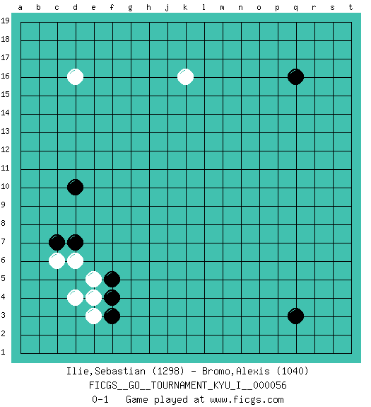 Last move : 0-1 2014 December 13 1:36:15 [Event "FICGS__GO__TOURNAMENT_KYU_I__000056"] [Site "FICGS"] [Date "2014.10.19"] [Round "1"] [Black "Ilie,Sebastian"] [White "Bromo,Alexis"] [Result "0-1"] [Rating 1 "1298"] [Rating 2 "1040"] 1.q16 d4 2.q3 d16 3.f3 e3 4.f4 e4 5.f5 e5 6.d10 k16 7.d7 d6 8.c7 c6 0-1 This go game has been lost on time (started : 2014.10.19 10:35:24) Here are the names of the openings (joseki) played in the four corners : Corner d4 : d4 f3 Hoshi (Hwajeom, Seongjeom, Xingwei`) 4-4 Point. The star or hoshi (4-4) point, emphasizing influence at the potential expense of territory. Ikken Kakari (Hankan Keolch'im, Yi Gua`jiao~, 1-Space Low Approach). Black 2 is the standard approach move to the 4-4. Player White won this Go (weiqi, baduk) game. Follow this game move after move (download)Always remember, keep the balance. [between territory and influence] (Figaro) There will be no order, only chaos. (Sol Robeson in Pi by Darren Aronofsky)