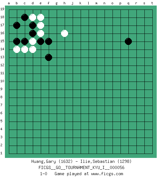 Last move : 1-0 2014 December 11 1:18:56 [Event "FICGS__GO__TOURNAMENT_KYU_I__000056"] [Site "FICGS"] [Date "2014.10.19"] [Round "1"] [Black "Huang,Gary"] [White "Ilie,Sebastian"] [Result "1-0"] [Rating 1 "1632"] [Rating 2 "1298"] 1.q15 e16 2.d16 d15 3.e15 e17 4.c15 d14 5.d17 c14 6.b15 b14 7.f15 d18 8.c18 e18 9.b17 h16 10.f13 1-0 This go game has been lost on time (started : 2014.10.19 10:35:24) Here are the names of the openings (joseki) played in the four corners : Corner d16 : e16 d16 Takamoku (Gomok, Gaomu`) 5-4 Point. The takamoku (high) point (5-4). With its emphasis on influence, the 5-4 point complements the 4-4 (hoshi) point in creating an influence-oriented fuseki. Player Black won this Go (weiqi, baduk) game. Follow this game move after move (download)Answer the keima with a kosumi. (Anonymous) I fear not the man who has practiced 10,000 kicks once, but I fear the man who has practiced one kick 10,000 times. (Bruce Lee)