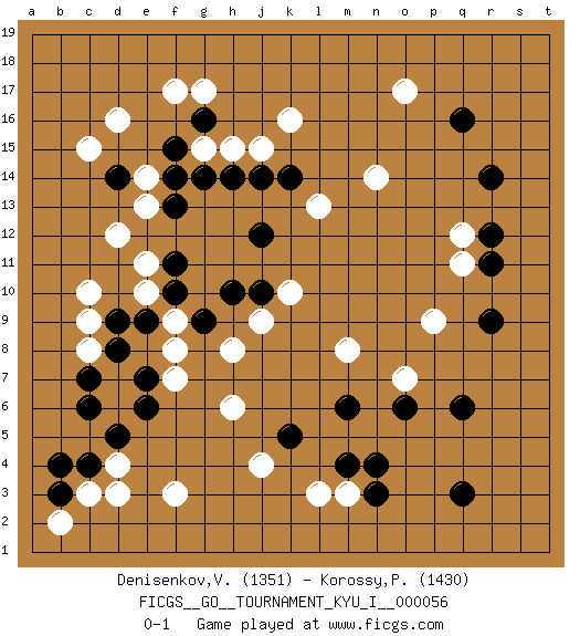 Last move : 0-1 2015 January 24 17:50:18 [Event "FICGS__GO__TOURNAMENT_KYU_I__000056"] [Site "FICGS"] [Date "2014.10.19"] [Round "1"] [Black "Denisenkov,Valentin"] [White "Korossy,Peter"] [Result "0-1"] [Rating 1 "1351"] [Rating 2 "1430"] 1.q16 d4 2.q3 d16 3.r9 o17 4.r14 k16 5.c6 c8 6.e6 f3 7.d9 c9 8.d8 c10 9.c7 d12 10.b4 c3 11.b3 b2 12.c4 d3 13.d5 j4 14.n4 m3 15.n3 k10 16.g16 f17 17.g14 g17 18.d14 c15 19.k14 h15 20.h14 g15 21.f15 j15 22.j14 n14 23.f11 e13 24.f13 p9 25.q6 q12 26.r12 q11 27.r11 o7 28.m6 m8 29.m4 l3 30.o6 l13 31.j12 h8 32.k5 f7 33.e7 e10 34.g9 e14 35.f14 f8 36.e9 f9 37.f10 e11 38.j10 j9 39.h10 h6 0-1 This go game has been lost on time (started : 2014.10.19 10:35:24) Here are the names of the openings (joseki) played in the four corners : Corner q16 : q16 o17 Hoshi (Hwajeom, Seongjeom, Xingwei`) 4-4 Point. The star or hoshi (4-4) point, emphasizing influence at the potential expense of territory. Ikken Kakari (Hankan Keolch'im, Yi Gua`jiao~, 1-Space Low Approach). White 2 is the standard approach move to the 4-4. Corner d4 : d4 c6 Hoshi (Hwajeom, Seongjeom, Xingwei`) 4-4 Point. The star or hoshi (4-4) point, emphasizing influence at the potential expense of territory. Ikken Kakari (Hankan Keolch'im, Yi Gua`jiao~, 1-Space Low Approach). Black 2 is the standard approach move to the 4-4. Player White won this Go (weiqi, baduk) game. Follow this game move after move (download)Don't make dango's. (Anonymous) Gambling : The sure way of getting nothing from something. (Wilson Mizner)