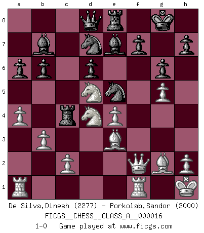 Last move : 1-0 2007 November 23 7:33:52 [Event "FICGS__CHESS__CLASS_A__000016"] [Site "FICGS"] [Date "2007.02.23"] [Round "1"] [White "De Silva,Dinesh"] [Black "Porkolab,Sandor"] [Result "1-0"] [WhiteElo "2277"] [BlackElo "2000"] 1.e4 c5 2.Nf3 d6 3.d4 cxd4 4.Nxd4 Nf6 5.Nc3 a6 6.Be3 e6 7.Be2 Be7 8.f4 O-O 9.O-O Nc6 10.a4 Qc7 11.Kh1 Re8 12.Bf3 Rb8 13.Qd2 Bd7 14.Nb3 b6 15.g4 Bc8 16.g5 Nd7 17.Bg2 Na5 18.Qf2 Nc4 19.Bc1 Bb7 20.Nd4 Rbc8 21.f5 exf5 22.Qxf5 Nce5 23.Nd5 Qd8 24.Be3 g6 25.Qf4 Rc4 26.Qg3 Nc6 27.Qf2 Nce5 28.b3 1-0 This chess game has been lost on time (started : 2007.02.23 0:30:14) Sicilian : Najdorf, Byrne (English) attack Kingside Castling by player Black (move 8) Kingside Castling by player White (move 9) Player White won this chess game. Follow this game move after move (download)Live, lose, and learn, by observing your opponent how to win. (Amber Steenbock) Wie ich sie so einen nach dem anderen nieder mähte wurde meine Überlegenheit offensichtlich. (José Raúl Capablanca) El Ajedrez es la vida. (Bobby Fischer) Je crois qu'il existe des manières très spécifiques de jouer efficacement contre une machine. Evidemment, nous n'avons aucune chance en technique pure, parce que l'ordinateur calcule de manière parfaite. Mais lorsque nous faisons appel à notre cerveau, en utilisant l'intuition et la compréhension, alors nous restons beaucoup plus forts. (Anatoli Karpov) A good teacher is like a candle - it consumes itself to light the way for others. (Author unknown)