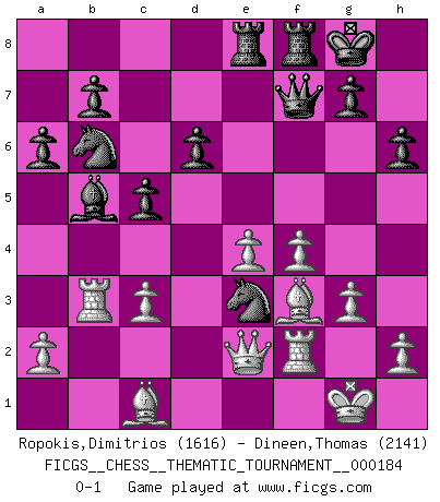 Last move : 0-1 2015 April 29 20:55:47 [Event "FICGS__CHESS__THEMATIC_TOURNAMENT__000184"] [Site "FICGS"] [Date "2014.10.22"] [Round "1"] [White "Ropokis,Dimitrios"] [Black "Dineen,Thomas"] [Result "0-1"] [WhiteElo "1616"] [BlackElo "2141"] 1.d4 Nf6 2.c4 e5 3.dxe5 Ng4 4.Bf4 Nc6 5.Nf3 Bb4+ 6.Nc3 Bxc3+ 7.bxc3 Qe7 8.Qd5 f6 9.exf6 Nxf6 10.Qd1 d6 11.Nd4 O-O 12.g3 Qe4 13.f3 Qe7 14.Bg2 Ne5 15.O-O Nxc4 16.e4 Qf7 17.Qe2 Nd7 18.Bc1 Ndb6 19.Rb1 Bd7 20.Rf2 a6 21.f4 Rae8 22.Rb3 h6 23.Bf3 c5 24.Nc2 Bb5 25.Ne3 Nxe3 0-1 Budapest : Rubinstein variation Kingside Castling by player Black (move 11) Kingside Castling by player White (move 15) Player Black won this chess game. Follow this game move after move (download)Avoid the crowd. Do your own thinking independently. Be the Chess player, not the Chess piece. (Ralph Charell) Ich würde die 30 stärksten Spieler der USA im Simultanspiel besiegen. (José Raúl Capablanca) Combinaciones deslumbrantes son para la mayoría, mover madera es para los pocos. (Georg Kieninger) Le temps de noter son nom sur la feuille de partie, j'étais déjà en zeitnot ! D'un modeste amateur apparié lors de la première ronde d'un open contre le grand-maître Azmaïparashvili. But they are useless. They can only give you answers. (Pablo Picasso, about computers)