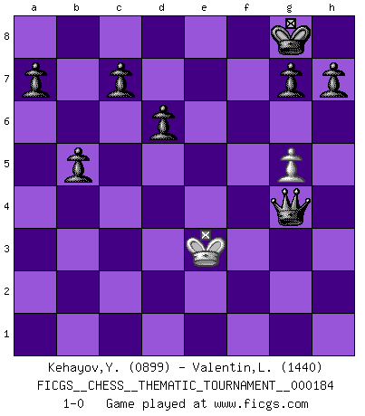 Last move : 1-0 2015 May 15 10:6:27 [Event "FICGS__CHESS__THEMATIC_TOURNAMENT__000184"] [Site "FICGS"] [Date "2014.10.22"] [Round "1"] [White "Kehayov,Yulian"] [Black "Valentin,Laurentiu"] [Result "1-0"] [WhiteElo "0899"] [BlackElo "1440"] 1.d4 Nf6 2.c4 e5 3.dxe5 Ng4 4.e4 Nxe5 5.Nf3 Nbc6 6.Be2 Be7 7.Nxe5 Nxe5 8.O-O O-O 9.h3 f5 10.exf5 Rxf5 11.Nc3 Bc5 12.Bg4 Nxg4 13.Qxg4 d6 14.Bd2 Rxf2 15.Qxc8 Rxf1+ 16.Kxf1 Rxc8 17.Re1 Qf6+ 18.Ke2 Re8+ 19.Kd1 Rxe1+ 20.Bxe1 Qd4+ 21.Kc2 Qxc4 22.g3 b5 23.b3 Qf1 24.Bd2 Qxh3 25.Nd5 Qf5+ 26.Kb2 Qxd5 27.Kc2 Ba3 28.g4 Qd4 29.g5 Qb2+ 30.Kd3 Qxa2 31.b4 Qc4+ 32.Ke3 Bxb4 33.Bxb4 Qxb4 34.Kd3 Qg4 35.Ke3 1-0 This chess game has been lost on time (started : 2014.10.22 0:6:24) Budapest : Alekhine variation Kingside Castling by player White (move 8) Kingside Castling by player Black (move 8) 10 pieces endgame at move 33 : White KP , Black KQPPPPPP WHITE : King + 1 Pawn BLACK : King + 1 Queen 6 Pawns Player White won this chess game. Follow this game move after move (download)The isolated Pawn casts gloom over the entire chessboard. (Aaron Nimzovich) Das Schachspiel ist ein See, in welchem eine Mücke baden und ein Elefant ertrinken kann. (Emanuel Lasker) El jugador blanco perdió porque fallo en recordar la coreccta continuación y tuvo que pensar por sí mismo las movidas. (Siegbert Tarrasch) Il n'y a pas eu de défaite parce que je ne crois pas que cet ordinateur ait jamais existé. IBM a triché en refusant d'imprimer les modes de recherche de la machine. C'est évident, pendant le match, des coups décisifs ont été joués par des êtres humains. Aujourd'hui, les meilleurs spécialistes en informatique ne peuvent toujours pas expliquer comment Deep-Blue a pu jouer contre la logique des ordinateurs. IBM a gagné une guerre de communication, mais ils sont incapables de prouver que l'ordinateur a gagné tout seul. (Garry Kasparov) The smarter you play, the luckier you'll be. (Mark Pilarski)