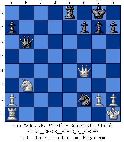 Last move : 0-1 2015 February 23 0:54:53 [Event "FICGS__CHESS__RAPID_D__000086"] [Site "FICGS"] [Date "2014.10.22"] [Round "1"] [White "Piantadosi,Angelo"] [Black "Ropokis,Dimitrios"] [Result "0-1"] [WhiteElo "1371"] [BlackElo "1616"] 1.e4 b6 2.d4 Bb7 3.Nc3 e6 4.Nf3 c5 5.Be3 Nf6 6.dxc5 Bxc5 7.Bxc5 bxc5 8.Bc4 d5 9.exd5 exd5 10.Bb5+ Nc6 11.O-O O-O 12.Re1 Qb6 13.Bxc6 Bxc6 14.Ne5 d4 15.Nxc6 Qxc6 16.Ne2 Rfe8 17.c3 Qb5 18.cxd4 cxd4 19.Nxd4 Rxe1+ 20.Qxe1 Qxb2 21.Nb3 Re8 22.Qd1 Ne4 23.Qc1 Qxf2+ 24.Kh1 Qb6 25.Qf4 Nf2+ 0-1 Owen defense Kingside Castling by player White (move 11) Kingside Castling by player Black (move 11) Player Black won this chess game. Follow this game move after move (download)Fischer Chess play was always razor-sharp, rational and brilliant. One of the best ever. (Dave Regis) In der Schule lernt man nichts. Es ist nur Zeitverschwendung. (Robert James Fischer) Estaba muy claro de que el punto vulnerable del Gran Maestro Americano (Bobby Fischer) radicaba en las posiciones de doble filo, colgantes, irracionales, donde el siempre falló en encontrar un triunfo aún en una posición de clara victoria. (Efim Geller) L'attaque fait le spectacle, la défense gagne les matchs. (Dicton footballistique) Lottery : A tax on people who are bad at math. (Author unknown)