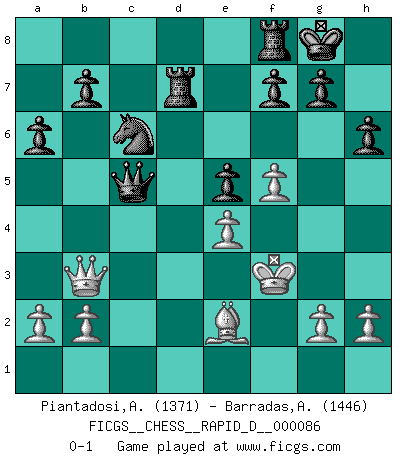 Last move : 0-1 2014 December 13 3:4:34 [Event "FICGS__CHESS__RAPID_D__000086"] [Site "FICGS"] [Date "2014.10.22"] [Round "1"] [White "Piantadosi,Angelo"] [Black "Barradas,Anderson"] [Result "0-1"] [WhiteElo "1371"] [BlackElo "1446"] 1.e4 c5 2.Nf3 d6 3.d4 cxd4 4.Nxd4 a6 5.Nc3 e5 6.Nb3 Nf6 7.Be2 Nc6 8.Bg5 h6 9.Bxf6 Qxf6 10.Nd5 Qd8 11.O-O Be6 12.c4 Be7 13.f4 O-O 14.f5 Bd7 15.Rc1 Rc8 16.Qd2 Bg5 17.Qd3 Bxc1 18.Rxc1 Qg5 19.Nb6 Rc7 20.Nxd7 Rxd7 21.c5 Nb4 22.Qc4 Nc6 23.cxd6 Rxd6 24.Nc5 Rd4 25.Qb3 Qxc1+ 26.Kf2 Qxc5 27.Kf3 Rd7 0-1 Sicilian Kingside Castling by player White (move 11) Kingside Castling by player Black (move 13) Player Black won this chess game. Follow this game move after move (download)Pawns: they are the soul of this game, they alone form the attack and defense. (Philidor) Immer nach dem besten Zug zu suchen ist ziemlich unpraktisch. (Nigel Short) La mitad de las variaciones que son calculadas en una partida de torneo, resultan ser completamente superfluas. Desafortunadamente, nadie sabe por adelantado cual mitad. (Jan Tinman) La tactique est l'élément le plus important du milieu de jeu. (Siegbert Tarrasch) Locking firmely the window serves nothing, only small thiefs pass through there, the big thiefs enter through the front door. (Luc-Olivier Leclerc)