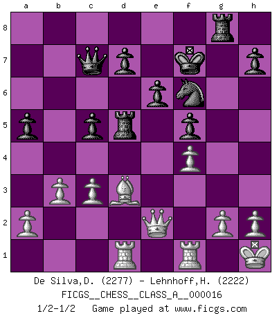 Last move : 1/2-1/2 2007 September 2 0:15:22 [Event "FICGS__CHESS__CLASS_A__000016"] [Site "FICGS"] [Date "2007.02.23"] [Round "1"] [White "De Silva,Dinesh"] [Black "Lehnhoff,Heinz-Georg"] [Result "1/2-1/2"] [WhiteElo "2277"] [BlackElo "2222"] 1.e4 c5 2.Nf3 e6 3.d4 cxd4 4.Nxd4 Nc6 5.Nc3 Qc7 6.Be2 Nf6 7.Be3 a6 8.O-O Bb4 9.Na4 Be7 10.Nxc6 bxc6 11.Nb6 Rb8 12.Nxc8 Qxc8 13.Bd4 c5 14.Be5 Rb6 15.b3 Nxe4 16.Bxg7 Rg8 17.Be5 Bd6 18.Bg3 f5 19.Bxd6 Rxd6 20.Bd3 Qa8 21.f3 Nf6 22.Qe1 Kf7 23.Rd1 Qc6 24.Kh1 Rd5 25.Qe2 a5 26.c3 Qc7 27.f4 1/2-1/2 Sicilian : Taimanov (Bastrikov) variation Kingside Castling by player White (move 8) This chess game ended in a draw. Follow this game move after move (download)My style is somewhere between that of Tal and Petrosian. (Reshevsky) Ein Großmeister muß tausende Partien in seinem Kopf speichern, denn diese sind für Ihn, was die Worte der Muttersprache für gewöhnliche Leute sind, oder Noten für Musiker... (Garry Kasparov) El Ajedrez es un expediente tonto que hace creer a la gente inactiva que hacen una cosa muy astuta cuando solamente estan perdiendo su tiempo. (George Bernard Shaw) Mon pion favori sur ma case favorite ! Bronstein en parlant d'un coup de pion en h5 quand il avait les Noirs. Real knowledge is to know the extent of one's ignorance. (Confucius)