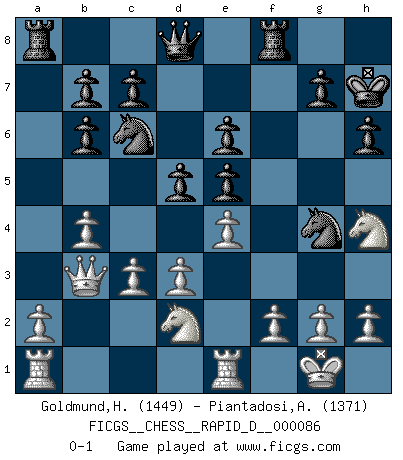 Last move : 0-1 2014 December 23 3:2:57 [Event "FICGS__CHESS__RAPID_D__000086"] [Site "FICGS"] [Date "2014.10.22"] [Round "1"] [White "Goldmund,Heike"] [Black "Piantadosi,Angelo"] [Result "0-1"] [WhiteElo "1449"] [BlackElo "1371"] 1.e4 e5 2.Nf3 Nc6 3.Bc4 Bc5 4.c3 Nf6 5.d3 d6 6.b4 Bb6 7.O-O O-O 8.Re1 h6 9.Nh4 Be6 10.Bxe6 fxe6 11.Be3 d5 12.Bxb6 axb6 13.Qb3 Kh7 14.Nd2 Ng4 0-1 This chess game has been lost on time (started : 2014.10.22 11:38:55) Giuoco Piano Kingside Castling by player White (move 7) Kingside Castling by player Black (move 7) Player Black won this chess game. Follow this game move after move (download)Many have become Chess Masters, no one has become the Master of Chess. (Siegbert Tarrasch) Der vorletzte Fehler gewinnt. (Savielly Grigorievitsch Tartakower) Yo creo que el Ajedrez posee una magia que es también una ayuda en la edad avanzada. Una rodilla reumática es olvidada durante una partida de Ajedrez y otros eventos pueden parecer algo sin importancia comparada a una catástrofe en el tablero de Ajedrez. (Vlastimil Hort) Ce qui est bien, c'est d'avoir tout un tas de pièces en prise : l'adversaire ne peut en prendre qu'une à la fois. Cité par Thierry Audin. I don't diet. I just don't eat as much as I'd like to. (Linda Evangelista, supermodel)