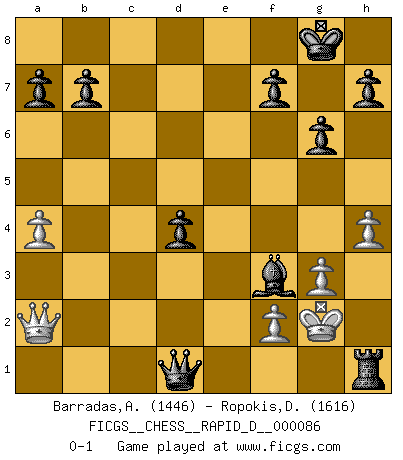 Last move : 0-1 2015 February 12 13:14:3 [Event "FICGS__CHESS__RAPID_D__000086"] [Site "FICGS"] [Date "2014.10.22"] [Round "1"] [White "Barradas,Anderson"] [Black "Ropokis,Dimitrios"] [Result "0-1"] [WhiteElo "1446"] [BlackElo "1616"] 1.e4 e5 2.Nf3 Nf6 3.Nxe5 d6 4.Nf3 Nxe4 5.d4 d5 6.Nc3 Nxc3 7.bxc3 Be7 8.Be2 O-O 9.O-O c5 10.a4 Nc6 11.Ba3 cxd4 12.cxd4 Re8 13.Bb5 Bxa3 14.Rxa3 Qd6 15.Re1 Rxe1+ 16.Qxe1 Qxa3 17.c3 Bd7 18.h3 Re8 19.Qb1 Qxc3 20.Bxc6 Bxc6 21.Kh2 Re2 22.Ng5 g6 23.h4 Re1 24.Qa2 Qxd4 25.g3 Qd1 26.Kh3 Rh1+ 27.Kg2 d4 28.Nf3 Bxf3+ 0-1 Petrov : Classical attack Kingside Castling by player Black (move 8) Kingside Castling by player White (move 9) Player Black won this chess game. Follow this game move after move (download)Spassky will not be psyched out by Fischer. (Mike Goodall) Die Leute spielen gegen mich seit 15 Jahren unter Ihren Möglichkeiten. (Robert James Fischer) El Ajedrez es imaginación. (David Bronstein) J'ai toujours senti une vague pitié pour l'homme qui ne connaît rien aux échecs, tout comme j'en aurais pour un homme ignorant de l'amour. Les Echecs, comme la musique ou comme l'amour, ont le pouvoir de rendre heureux. (Siegbert Tarrasch) Cactus - It is depressed cucumber. (Ilmars Cirulis)