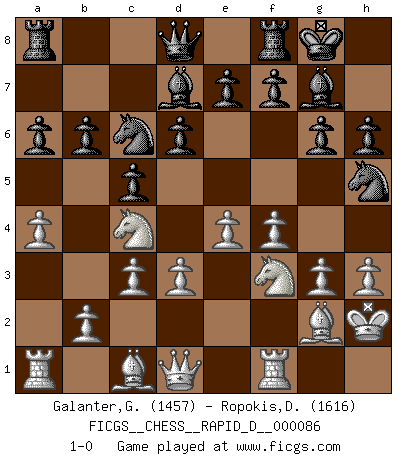 Last move : 1-0 2015 February 25 18:17:36 [Event "FICGS__CHESS__RAPID_D__000086"] [Site "FICGS"] [Date "2014.10.22"] [Round "1"] [White "Galanter,Gregory"] [Black "Ropokis,Dimitrios"] [Result "1-0"] [WhiteElo "1457"] [BlackElo "1616"] 1.e4 c5 2.Nf3 g6 3.g3 Bg7 4.Bg2 Nc6 5.O-O Nf6 6.d3 O-O 7.c3 d6 8.Nbd2 a6 9.a4 b6 10.Nc4 Bg4 11.h3 Be6 12.Ng5 Bd7 13.f4 h6 14.Nf3 Nh5 15.Kh2 1-0 Sicilian : Hungarian variation Kingside Castling by player White (move 5) Kingside Castling by player Black (move 6) Player White won this chess game. Follow this game move after move (download)Chess is above all, a fight ! (Emanuel Lasker) Je älter ich werde, um so mehr schätze ich die Bauern. (Paul Keres) La señal de un Gran Maestro es su habilidad de ganar una partida rápidamente y sin dolor. (Irving Chernev) Les sacrifices démontrent seulement que quelqu'un a gaffé. (Savielly Tartacover) You can't play chess if you're groggy from pills. (Anatoly Karpov)