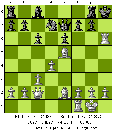 Last move : 1-0 2014 December 21 21:59:19 [Event "FICGS__CHESS__RAPID_D__000086"] [Site "FICGS"] [Date "2014.10.22"] [Round "1"] [White "Hilbert,Stephan J."] [Black "Brulland,Emmanuel"] [Result "1-0"] [WhiteElo "1425"] [BlackElo "1307"] 1.e4 c6 2.Nc3 d5 3.Nf3 e6 4.d4 Nd7 5.Bd3 dxe4 6.Nxe4 Ngf6 7.Bg5 Be7 8.c3 O-O 9.O-O h6 10.Bh4 Re8 11.Bg3 Nxe4 12.Bxe4 Nf6 13.Bd3 Bf8 14.Bh4 Be7 15.Qc2 Nd5 16.Bg3 Bd6 17.Rad1 Nf4 18.Bc4 Nd5 19.Ne5 Bxe5 20.Bxe5 Nf6 21.Be2 Qe7 22.Rd3 Nd7 23.Bf4 Nf6 24.Rg3 Kh8 25.Be5 Rg8 26.Rh3 Nd7 27.Rxh6+ 1-0 Caro-Kann : Two knights variation Kingside Castling by player Black (move 8) Kingside Castling by player White (move 9) Player White won this chess game. Follow this game move after move (download)Chess is so inspiring that I do not believe a good player is capable of having an evil thought during the game. (Wilhelm Steinitz) Der zweitbeste Zug ist oft der einzig richtige. (Savielly Grigorievitsch Tartakower) Yo no creo en la psicología. Yo creo en las buenas movidas. (Bobby Fischer) Un millionnaire : 'Monsieur Steinitz ! Vous ne participez aux tournois que pour l'argent, alors que moi je n'y viens que pour l'honneur.' Steinitz : 'Chacun joue pour ce qu'il n'a pas'... Go and wake up your luck. (Persian saying)