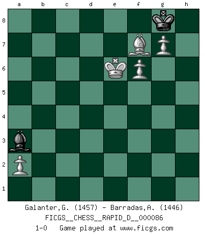 Last move : 1-0 2015 January 8 16:51:50 [Event "FICGS__CHESS__RAPID_D__000086"] [Site "FICGS"] [Date "2014.10.22"] [Round "1"] [White "Galanter,Gregory"] [Black "Barradas,Anderson"] [Result "1-0"] [WhiteElo "1457"] [BlackElo "1446"] 1.e4 c6 2.d3 d5 3.Nd2 e5 4.Ngf3 Bg4 5.h3 Bh5 6.g3 dxe4 7.dxe4 Bc5 8.Bg2 Bxf3 9.Qxf3 Nf6 10.O-O O-O 11.Rd1 Nbd7 12.Nb3 Bb6 13.Bg5 Qe7 14.Rxd7 Qxd7 15.Bxf6 gxf6 16.Qxf6 Qe6 17.Qg5+ Kh8 18.Rd1 Rg8 19.Qh4 f5 20.exf5 Qxf5 21.g4 Qf7 22.Be4 Raf8 23.Rd2 Bd8 24.Qg3 Bg5 25.Qxe5+ Rg7 26.Re2 Bf6 27.Qa5 Qc4 28.Bd3 Qf4 29.Qa3 Be7 30.Qxa7 Qb4 31.Qd4 Qxd4 32.Nxd4 Rf4 33.Ne6 Bd6 34.Nxf4 Bxf4 35.Re8+ Rg8 36.Rxg8+ Kxg8 37.Kg2 Kf7 38.Kf3 Be5 39.c3 h6 40.Ke4 Kf6 41.f4 Bd6 42.h4 b6 43.b4 c5 44.g5+ hxg5 45.hxg5+ Kg7 46.f5 cxb4 47.cxb4 Bxb4 48.Ke5 Bc3+ 49.Ke6 Bd4 50.f6+ Kf8 51.g6 b5 52.Bxb5 Bb2 53.g7+ Kg8 54.Be8 Ba3 55.Bf7+ 1-0 Caro-Kann : Closed (Breyer) variation Kingside Castling by player White (move 10) Kingside Castling by player Black (move 10) 10 pieces endgame at move 46 : White KBPPPP , Black KBPP WHITE : King + 1 Bishop 4 Pawns BLACK : King + 1 Bishop 2 Pawns 9 pieces endgame at move 47 : White KBPPPP , Black KBP WHITE : King + 1 Bishop 4 Pawns BLACK : King + 1 Bishop 1 Pawn 8 pieces endgame at move 47 : White KBPPP , Black KBP WHITE : King + 1 Bishop 3 Pawns BLACK : King + 1 Bishop 1 Pawn 7 pieces endgame at move 52 : White KBPPP , Black KB WHITE : King + 1 Bishop 3 Pawns BLACK : King + 1 Bishop Player White won this chess game. Follow this game move after move (download)I give 98 percent of my mental energy to Chess. Others give only 2 percent. (Bobby Fischer) Wie bekannt hörte Morphy 1859 auf, Schach zu spielen. Seine Enttäuschung galt nicht so sehr dem Schach, wie den Schachspielern. (Robert James Fischer) El arma más poderosa en el Ajedrez, es tener la próxima movida. (David Bronstein) Mais n'est-ce pas déjà le limiter injurieusement que d'appeler les échecs un jeu? N'est-ce pas aussi une science, un art, ou quelque chose qui, comme le cercueil de Mahomet entre ciel et terre, est suspendu entre l'un et l'autre, et qui réunit un nombre incroyable de contraires ? (Stefan Zweig) Political correctness is subjecting us to gross incompetence. (Johann Piek)