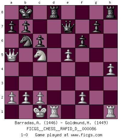 Last move : 1-0 2015 January 8 16:20:7 [Event "FICGS__CHESS__RAPID_D__000086"] [Site "FICGS"] [Date "2014.10.22"] [Round "1"] [White "Barradas,Anderson"] [Black "Goldmund,Heike"] [Result "1-0"] [WhiteElo "1446"] [BlackElo "1449"] 1.e4 d5 2.exd5 Qxd5 3.Nc3 Qa5 4.Nf3 Nf6 5.d3 Bg4 6.h3 Bh5 7.Be2 c6 8.Bd2 Qc7 9.g4 Bg6 10.Qc1 e6 11.Be3 Nbd7 12.Bf4 Bd6 13.Bxd6 Qxd6 14.Qd2 Nb6 15.g5 Nfd5 16.d4 O-O-O 17.Ne5 Qe7 18.h4 Nxc3 19.Qxc3 Be4 20.Bf3 Bxf3 21.Nxf3 Nd5 22.Qd2 h6 23.O-O-O hxg5 24.Nxg5 f6 25.Ne4 e5 26.Nc5 Nb6 27.Qa5 Kb8 28.dxe5 1-0 This chess game has been lost on time (started : 2014.10.22 11:38:55) Scandinavian (centre counter) defense Queenside Castling by player Black (move 16) Queenside Castling by player White (move 23) Player White won this chess game. Follow this game move after move (download)Not only will I predict his triumph over Botvinnik, but I'll go further and say that he'll probably be the greatest Chess player that ever lived. (John Collins) Spiel ein langweiliges Spiel zu Ende und lustige Dinge können passieren. (Hans Ree) El Ajedrez tiene tanto misterio como las mujeres. (Purdy) Même si vous avez un bon coup à faire, regardez toujours s'il n'y en a pas un qui lui soit préférable. (Pedro Damiano) The production of too many useful things results in too many useless people. (Karl Marx)