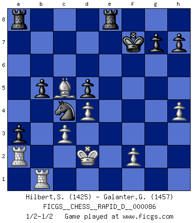 Last move : 1/2-1/2 2015 February 19 17:53:8 [Event "FICGS__CHESS__RAPID_D__000086"] [Site "FICGS"] [Date "2014.10.22"] [Round "1"] [White "Hilbert,Stephan J."] [Black "Galanter,Gregory"] [Result "1/2-1/2"] [WhiteElo "1425"] [BlackElo "1457"] 1.e4 c5 2.b4 cxb4 3.a3 bxa3 4.Nxa3 Nc6 5.d4 d5 6.e5 e6 7.c3 f6 8.Nf3 a6 9.Nb5 Bd7 10.Nd6+ Bxd6 11.exd6 Nh6 12.Nh4 Nf7 13.Ba3 Qb8 14.Qg4 O-O 15.Bd3 Rd8 16.Qh5 f5 17.g4 Nxd6 18.gxf5 Nxf5 19.Nxf5 exf5 20.Bxf5 Bxf5 21.Qxf5 Qc7 22.Kd2 Qf7 23.Qxf7+ Kxf7 24.Rhb1 Na5 25.Bb4 Nc4+ 26.Kd3 Re8 27.Bc5 b5 28.Re1 a5 29.Reb1 Reb8 30.h4 a4 31.Rb4 a3 32.R4b1 Nb2+ 33.Kc2 Nc4 34.Ra2 Re8 35.Kd3 Nb2+ 36.Kd2 Nc4+ 1/2-1/2 Sicilian : wing gambit, Carlsbad variation Kingside Castling by player Black (move 14) This chess game ended in a draw. Follow this game move after move (download)Help your pieces so they can help you. (Paul Morphy) Fischer ist das größte Genie, das je vom Schachhimmel heruntergestiegen ist. (Mikhail Nekhemyevich Tal) Los finales de Peón son del Ajedrez lo que el cesped es del Golf. (Cecil Purdy) Demandez au pauvre Cg1 ce qu'il en pense. Eduard Gufeld à propos de la variante Saemisch de l'Est-Indienne. Horse racing is animated roulette. (Roger Kahn)