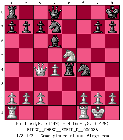 Last move : 1/2-1/2 2015 January 18 12:10:36 [Event "FICGS__CHESS__RAPID_D__000086"] [Site "FICGS"] [Date "2014.10.22"] [Round "1"] [White "Goldmund,Heike"] [Black "Hilbert,Stephan J."] [Result "1/2-1/2"] [WhiteElo "1449"] [BlackElo "1425"] 1.e4 e5 2.Nf3 d5 3.exd5 Bd6 4.d4 e4 5.Ne5 Ne7 6.Bg5 O-O 7.Nc3 f6 8.Bxf6 Rxf6 9.Nxe4 Rf4 10.Bc4 Rxe4+ 11.Be2 Nxd5 12.Qd3 Bf5 13.O-O Nf4 14.Qc4+ Be6 15.Qb5 Nd7 16.Bc4 Bxc4 17.Qxc4+ Kh8 1/2-1/2 QP counter-gambit : Maroczy gambit Kingside Castling by player Black (move 6) Kingside Castling by player White (move 13) This chess game ended in a draw. Follow this game move after move (download)Capture of the adverse King is the ultimate but not the first object of the game. (William Steinitz) Taktik ist was man tun muß, wenn etwas zu tun ist. Strategie ist was man tun muß, wenn nichts zu tun ist. (Savielly Grigorievitsch Tartakower) El ganador de una partida es aquel jugador que hace el penúltimo error. (Savielly Tartakover) Nous vivons dans un monde échiquéen : chaque jour qui passe est un défi à relever. (Philosophe Sasha) You know what they say : You lie down with the Devil, you wake up in Hell. (Horatio Caine, C.S.I. Miami)