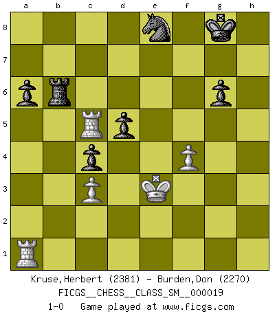 Last move : 1-0 2015 April 2 22:43:16 [Event "FICGS__CHESS__CLASS_SM__000019"] [Site "FICGS"] [Date "2014.10.27"] [Round "1"] [White "Kruse,Herbert"] [Black "Burden,Don"] [Result "1-0"] [WhiteElo "2381"] [BlackElo "2270"] 1.Nf3 g6 2.e4 d6 3.d4 Nf6 4.Nc3 Bg7 5.Be3 a6 6.Qd2 b5 7.Bh6 O-O 8.Bd3 Nc6 9.Nd5 Bg4 10.c3 Re8 11.h4 Nxd5 12.exd5 e5 13.dxe6 Rxe6+ 14.Kf1 Bxf3 15.gxf3 Bxh6 16.Qxh6 Ne7 17.h5 Qf8 18.Qg5 c5 19.f4 f5 20.d5 Nxd5 21.hxg6 hxg6 22.Rh6 Ne7 23.a4 c4 24.Be2 Qf6 25.Qg2 Rb8 26.axb5 d5 27.Bf3 Rxb5 28.Rd1 Kf8 29.Rh7 Rxb2 30.Qh1 Rb5 31.Rh8+ Kf7 32.Rc1 Nc6 33.Rh7+ Kg8 34.Rd1 Re7 35.Rh6 Re4 36.Bxe4 fxe4 37.Qh3 Ne7 38.Kg2 Nf5 39.Rh7 e3 40.Rc7 Qh4 41.Qxh4 Nxh4+ 42.Kf1 Nf5 43.Ra1 Rb6 44.fxe3 Nxe3+ 45.Kf2 Ng4+ 46.Kf3 Nf6 47.Ke3 Ne8 48.Rc5 1-0 Reti Opening Kingside Castling by player Black (move 7) Player White won this chess game. Follow this game move after move (download)Chess is imagination. (David Bronstein) Am wohlsten fühle ich mich, wenn ich sehe, wie sich mein Gegner im Todeskampf windet. (Robert James Fischer) Jugadores de primera clase pierden en contra de jugadores de segunda clase porque los jugadores de segunda clase a veces juegan una partida de primer clase. (Siegbert Tarrasch) Les réformistes prétendent que les progrès de la théorie conduiront à la disparition des échecs, et qu'il faut, pour leur rendre vie, en remanier les règles. En réalité, qu'exprime cette affirmation? Le mépris de l'intuition, de l'imagination et de tous les autres éléments qui font des échecs un art. (Alexander Alekhine) This is where the fun begins. (Anakin Skywalker in Star Wars ep.3)