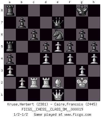 Last move : 1/2-1/2 2015 May 28 5:2:13 [Event "FICGS__CHESS__CLASS_SM__000019"] [Site "FICGS"] [Date "2014.10.27"] [Round "1"] [White "Kruse,Herbert"] [Black "Caire,Francois"] [Result "1/2-1/2"] [WhiteElo "2381"] [BlackElo "2445"] 1.Nf3 Nf6 2.g3 d5 3.Bg2 Bf5 4.O-O e6 5.c4 c6 6.cxd5 exd5 7.d3 Be7 8.Qb3 Qb6 9.Qc2 O-O 10.Nc3 Bg4 11.e4 Na6 12.Be3 Nb4 13.Qb3 Qd8 14.e5 Nd7 15.d4 Nb6 16.a3 Na6 17.h3 Be6 18.Ne2 Nc4 19.Bc1 Nc7 20.Qd1 Bf5 21.Ne1 Na5 22.Nc2 Nb3 23.Ne3 Nxc1 24.Nxf5 Nxe2+ 25.Qxe2 g6 26.Nxe7+ Qxe7 27.f4 f6 28.Rad1 Ne6 29.h4 a5 30.Bf3 a4 31.Qd2 f5 32.Rf2 Ra6 33.Rc1 h5 34.Kg2 Rfa8 35.Qd1 Kg7 36.Rd2 Kg8 37.Be2 R6a7 38.R1c2 Ra5 39.Qe1 1/2-1/2 Reti Opening Kingside Castling by player White (move 4) Kingside Castling by player Black (move 9) This chess game ended in a draw. Follow this game move after move (download)It is not enough to be a good player... you must also play well. (Siegbert Tarrasch) Modernes Schach sorgt sich zuviel um Dinge wie Bauernstruktur usw. Vergessen Sie das, Schachmatt beendet das Spiel! (Nigel Short) Hay jugadores fuertes y personas amables y yo soy un jugador fuerte. (Bobby Fischer) Ce qui est bien, c'est d'avoir tout un tas de pièces en prise : l'adversaire ne peut en prendre qu'une à la fois. Cité par Thierry Audin. Man is still the most extraordinary computer of all. (John F. Kennedy)