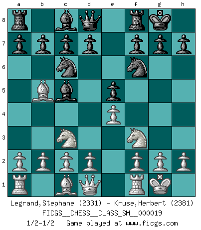 Last move : 1/2-1/2 2014 November 24 22:39:43 [Event "FICGS__CHESS__CLASS_SM__000019"] [Site "FICGS"] [Date "2014.10.27"] [Round "1"] [White "Legrand,Stephane"] [Black "Kruse,Herbert"] [Result "1/2-1/2"] [WhiteElo "2331"] [BlackElo "2381"] 1.e4 e5 2.Nf3 Nc6 3.Bb5 Nf6 4.Nc3 Bc5 5.O-O O-O 1/2-1/2 Ruy Lopez : Berlin defense Kingside Castling by player White (move 5) Kingside Castling by player Black (move 5) This chess game ended in a draw. Follow this game move after move (download)Methodical thinking is of more use in Chess than inspiration. (C. J. S. Purdy) Schon mancher Spieler hat aufgegeben, um zu vermeiden, daß er eine Figur verliert. (Savielly Grigorievitsch Tartakower) El jugador táctico sabe que hacer cuando hay algo que hacer; mientras que el estratega sabe que hacer cuando no hay nada que hacer. (Gerald Abrahams) Vouloir jouer aux échecs contre soi-même est aussi paradoxal que vouloir marcher sur son ombre. (Stefan Zweig) It's only after you lost everything, Tyler says, that you're free to do anything. (Chuck Palahniuk, Fight Club)