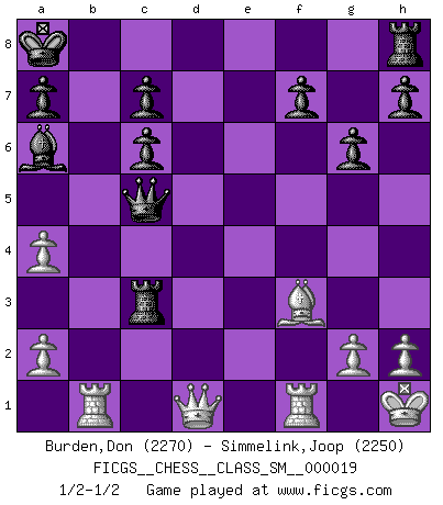 Last move : 1/2-1/2 2014 November 18 18:15:44 [Event "FICGS__CHESS__CLASS_SM__000019"] [Site "FICGS"] [Date "2014.10.27"] [Round "1"] [White "Burden,Don"] [Black "Simmelink,Joop"] [Result "1/2-1/2"] [WhiteElo "2270"] [BlackElo "2250"] 1.e4 e5 2.Nf3 Nc6 3.d4 exd4 4.Nxd4 Nf6 5.Nxc6 bxc6 6.e5 Qe7 7.Qe2 Nd5 8.c4 Ba6 9.b3 g6 10.f4 d6 11.Qf2 Nf6 12.Be2 dxe5 13.O-O Ne4 14.Qe1 O-O-O 15.Nc3 Nc5 16.fxe5 Bg7 17.Na4 Nxa4 18.Bg4+ Kb8 19.bxa4 Qxe5 20.Rb1+ Ka8 21.Bf3 Qc5+ 22.Be3 Bd4 23.Bxd4 Rxd4 24.Kh1 Rxc4 25.Qd1 Rc3 1/2-1/2 Scotch : Mieses variation Kingside Castling by player White (move 13) Queenside Castling by player Black (move 14) This chess game ended in a draw. Follow this game move after move (download)A man without frontiers. He didn't divide the East and the West, he brought them together in their admiration for him. (Ljubomir Ljubojevic, about Bobby Fischer's death) Warum muß ich gegen diesen IDIOTEN verlieren? (Aaron Nimzowitsch) Si tu oponente te ofrece un empate, trata de averiguar porque piensa él que esta en una posición peor. (Nigel Short) Les échecs, c'est l'imagination. (David Bronstein) See no evil, hear no evil, speak no evil. (The 3 monkeys)