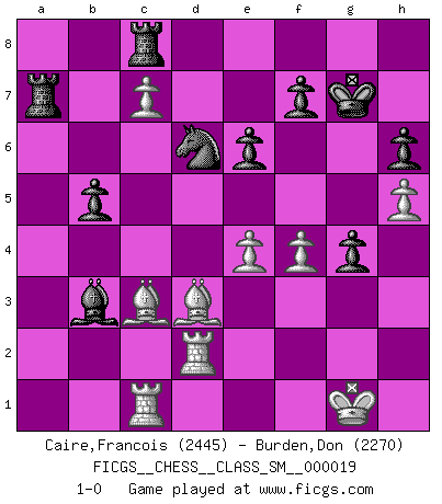 Last move : 1-0 2015 September 21 22:41:51 [Event "FICGS__CHESS__CLASS_SM__000019"] [Site "FICGS"] [Date "2014.10.27"] [Round "1"] [White "Caire,Francois"] [Black "Burden,Don"] [Result "1-0"] [WhiteElo "2445"] [BlackElo "2270"] 1.d4 Nf6 2.c4 e6 3.Nf3 d5 4.g3 Be7 5.Bg2 O-O 6.O-O dxc4 7.Qc2 a6 8.Qxc4 b5 9.Qc2 Bb7 10.Bd2 Ra7 11.Rc1 Be4 12.Qb3 Nc6 13.e3 Qa8 14.Qd1 Nb8 15.Ba5 Rc8 16.a3 h6 17.Nbd2 Bd5 18.Bf1 Nbd7 19.b4 Bd6 20.Rc2 Ne4 21.Rac1 Qb7 22.Rb2 Ndf6 23.Bd3 Re8 24.Rbc2 Rc8 25.h4 Qb8 26.Ne5 c5 27.bxc5 Bxe5 28.dxe5 Qxe5 29.c6 Nxd2 30.Qxd2 Ne4 31.Qb4 Qf5 32.Qe1 Re7 33.Qd1 Qe5 34.f4 Qf6 35.Qg4 g6 36.h5 Qf5 37.Qxf5 gxf5 38.a4 Ra7 39.c7 Nd6 40.Rd2 Kg7 41.g4 fxg4 42.e4 Bb3 43.axb5 axb5 44.Bc3+ 1-0 Queen's pawn game Kingside Castling by player Black (move 5) Kingside Castling by player White (move 6) Player White won this chess game. Follow this game move after move (download)Your body has to be in top condition. Your Chess deteriorates as your body does. You can't separate body from mind. (Bobby Fischer) Offener Brief an US-Präsident Bush anlässlich der Verhaftung Bobby Fishers: Verhaften Sie mich. Stecken Sie mich in dieselbe Zelle wie Bobby Fisher und geben Sie uns ein Schachspiel mit. (Boris Vassilievich Spassky) Los libros de Ajedrez deben de usarse igual como usamos los anteojos: para mejorar la vista, aunque algunos jugadores los quieren usar como si ellos les otorgaran la vision. (José Raúl Capablanca) Votre prénom est 'Tactique', votre deuxième prénom est 'Tactique' et votre nom est 'Tactique'. (Ken Smith) God, you are such an idiot. - Actually, I thought I was more of a jerk. (Gregory House to Stacy Warner, House M.D.)