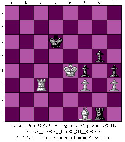 Last move : 1/2-1/2 2016 March 4 19:37:46 [Event "FICGS__CHESS__CLASS_SM__000019"] [Site "FICGS"] [Date "2014.10.27"] [Round "1"] [White "Burden,Don"] [Black "Legrand,Stephane"] [Result "1/2-1/2"] [WhiteElo "2270"] [BlackElo "2331"] 1.e4 c5 2.Nf3 d6 3.d4 cxd4 4.Nxd4 Nf6 5.Nc3 a6 6.h3 e5 7.Nde2 b5 8.Bg5 Nbd7 9.Nd5 Bb7 10.Nec3 Rc8 11.Bd3 Be7 12.Bxf6 Nxf6 13.O-O Nxd5 14.Nxd5 Bxd5 15.exd5 Qb6 16.a4 O-O 17.Qe2 bxa4 18.Rfb1 a5 19.Rxa4 g6 20.Bb5 Bd8 21.b4 axb4 22.Raxb4 Rb8 23.Rc4 Qa7 24.Rc6 Bc7 25.Qf1 Rb7 26.Ra1 Qb8 27.c4 Kg7 28.Kh1 Qd8 29.R1a6 Qf6 30.Qe1 h5 31.Qe3 Qf4 32.Qxf4 exf4 33.Kh2 h4 34.Ra2 Rd8 35.R2a6 Rd7 36.Ra1 Bb8 37.Kg1 Re7 38.Kf1 Re4 39.Rd1 g5 40.Ra6 Kf6 41.Rd2 Ke5 42.Rda2 Rd4 43.Ke2 Kf6 44.Rd2 Re7+ 45.Kd1 Ke5 46.Rxd4 Kxd4 47.f3 Rb7 48.Ke2 Re7+ 49.Kd1 Re3 50.Rb6 Bc7 51.Rc6 Re7 52.Ra6 Bb8 53.Rb6 Bc7 54.Ra6 Re3 55.Rc6 Ba5 56.Rxd6 Kc3 57.c5 Kb4 58.Ba6 Kxc5 59.Rf6 Re5 60.Rxf7 Kxd5 61.Rd7+ Kc6 62.Rd4 Re1+ 63.Kc2 Kc5 64.Ra4 Kb6 65.Bc4 Rg1 66.Kd3 Rxg2 67.Ke4 Bc3 68.Ra8 Kc5 69.Rc8+ Kd6 70.Bf1 Rg1 71.Rxc3 1/2-1/2 Sicilian : Najdorf, Adams attack Kingside Castling by player White (move 13) Kingside Castling by player Black (move 16) 10 pieces endgame at move 71 : White KRBPP , Black KRPPP WHITE : King + 1 Rook 1 Bishop 2 Pawns BLACK : King + 1 Rook 3 Pawns This chess game ended in a draw. Follow this game move after move (download)There's never before been a Chess player with such a thorough knowledge of the intricacies of the game and such an absolutely indomitable will to win. I think Bobby is the greatest player that ever lived. (Lisa Lane) Über Kasparov: Es ist offensichtlich, daß er in einem totalitären Staat aufwuchs und deshalb zu diktatorischen Zügen neigt. (Viktor Kortschnoi) La pasion por jugar al Ajedrez es una de las mas inexplicables en el mundo. (H.G. Wells) Si le désir cupide (et stupide) de gagner est une inépuisable source de souffrance, une combinaison brillante sur l'échiquier est une découverte : le coquelicot qui s'épanouit lorsque apparaît la Voie Lactée. (Arrabal) Big Chess is a place for big hallucinations. (Thibault de Vassal)