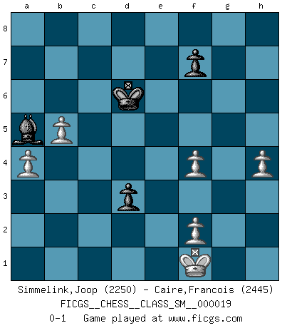 Last move : 0-1 2015 May 9 0:58:32 [Event "FICGS__CHESS__CLASS_SM__000019"] [Site "FICGS"] [Date "2014.10.27"] [Round "1"] [White "Simmelink,Joop"] [Black "Caire,Francois"] [Result "0-1"] [WhiteElo "2250"] [BlackElo "2445"] 1.e4 c5 2.Nf3 Nc6 3.d4 cxd4 4.Nxd4 Nf6 5.Nc3 e5 6.Ndb5 d6 7.Bg5 a6 8.Na3 b5 9.Bxf6 gxf6 10.Nd5 f5 11.Bd3 Be6 12.c3 Bg7 13.Nxb5 axb5 14.Bxb5 Rc8 15.Qa4 Bd7 16.exf5 O-O 17.O-O e4 18.Rfe1 Ne5 19.Bxd7 Nxd7 20.Qxe4 Nf6 21.Ne7+ Kh8 22.Qf3 Rc5 23.b4 Rc4 24.Rad1 Qc7 25.Rd3 Re8 26.Rde3 Bf8 27.Ng6+ hxg6 28.Rxe8 Nxe8 29.Qa8 Rxc3 30.g3 Rc1 31.Qxe8 Rxe1+ 32.Qxe1 gxf5 33.b5 d5 34.Qd1 Qd8 35.Qh5+ Kg7 36.Qxf5 d4 37.Qd3 Bb4 38.a4 Ba5 39.Kg2 Kf6 40.Qf3+ Ke7 41.Qe4+ Kf8 42.Qd3 Bb6 43.h4 Qd6 44.Kh2 Kg7 45.Kg2 Kg8 46.Kf3 Qd7 47.Kg2 Kg7 48.Kf3 Ba5 49.Kg2 Bd8 50.Kf3 Bb6 51.Kg2 Ba5 52.Kf3 Qd5+ 53.Qe4 Qb3+ 54.Kg2 d3 55.Qe5+ Kf8 56.Qc5+ Ke8 57.Qe5+ Kd7 58.Kf1 Qc4 59.Qf5+ Kc7 60.Qf4+ Qxf4 61.gxf4 Kd6 0-1 Sicilian : Pelikan (Lasker/Sveshnikov) variation Kingside Castling by player Black (move 16) Kingside Castling by player White (move 17) 10 pieces endgame at move 61 : White KPPPPP , Black KBPP WHITE : King + 5 Pawns BLACK : King + 1 Bishop 2 Pawns Player Black won this chess game. Follow this game move after move (download)I thought the most common mistake [in chess] was the first one: Learning the game :P (Garvin Gray, FICGS forum) Capablanka war das größte Genie der Schachgeschichte! Aber denken sie nicht er habe nichts vom Schach verstanden. Er wusste nur soviel wie er wissen musste um seine Ziele zu erreichen. (Mikhail Moiseyevich Botvinik) Tu cuerpo tiene que estar en óptima condición. Tu Ajedrez se deteriora como lo hace tu cuerpo. No puedes separar la mente y el cuerpo. (Bobby Fischer) J'ai vu le vaincu d'Echecs jouer des années durant dans l'espoir de la fête de la victoire. Car tu es plus riche de ce qu'elle existe si même elle n'est point pour toi. Ainsi de la perle du fond des mers. (Antoine de Saint-Exupéry) It's not the will to win, but the will to prepare to win that makes the difference. (Bear Bryant)