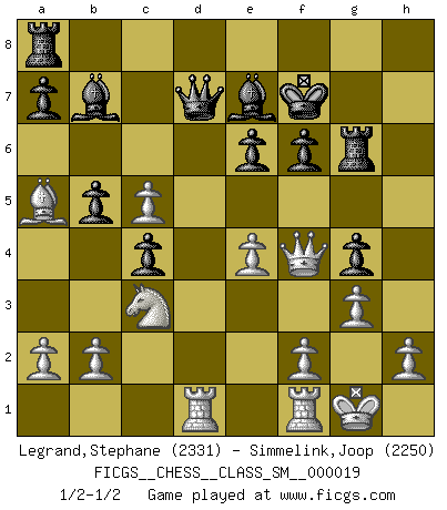 Last move : 1/2-1/2 2015 March 23 10:59:41 [Event "FICGS__CHESS__CLASS_SM__000019"] [Site "FICGS"] [Date "2014.10.27"] [Round "1"] [White "Legrand,Stephane"] [Black "Simmelink,Joop"] [Result "1/2-1/2"] [WhiteElo "2331"] [BlackElo "2250"] 1.d4 d5 2.c4 c6 3.Nc3 Nf6 4.Nf3 e6 5.Bg5 h6 6.Bh4 dxc4 7.e4 g5 8.Bg3 b5 9.Be2 Bb7 10.O-O Nbd7 11.Ne5 h5 12.Nxd7 Qxd7 13.Be5 Rh6 14.Qc1 Ng4 15.Bxg4 hxg4 16.Qxg5 Rg6 17.Qf4 Be7 18.Rad1 f6 19.Bb8 Qd8 20.Bc7 Qd7 21.Ba5 Kf7 22.g3 c5 23.dxc5 1/2-1/2 QGD Slav defense Kingside Castling by player White (move 10) This chess game ended in a draw. Follow this game move after move (download)Many Chess players were surprised when after the game, Fischer quietly explained: 'I had already analyzed this possibility' in a position which I thought was not possible to foresee from the opening. (Mikhail Tal) Rubinstein ist ein Turmendspiel, welches die Götter vor tausenden von Jahren begannen. (Savielly Grigorievitsch Tartakower) No hay un Gran Maestro de Ajedrez que sea normal; solo se diferencían ellos por la magnitud de su locura. (Viktor Korchnoi) A ce moment-là, je menaçais de comprendre la position ! (Clément L'Heureux) Wawaweewa ! (Borat: Cultural learnings of America for make benefit glorious nation of Kazakhstan)